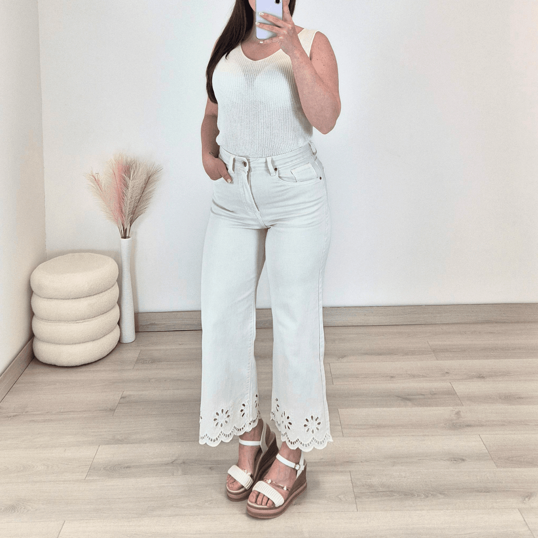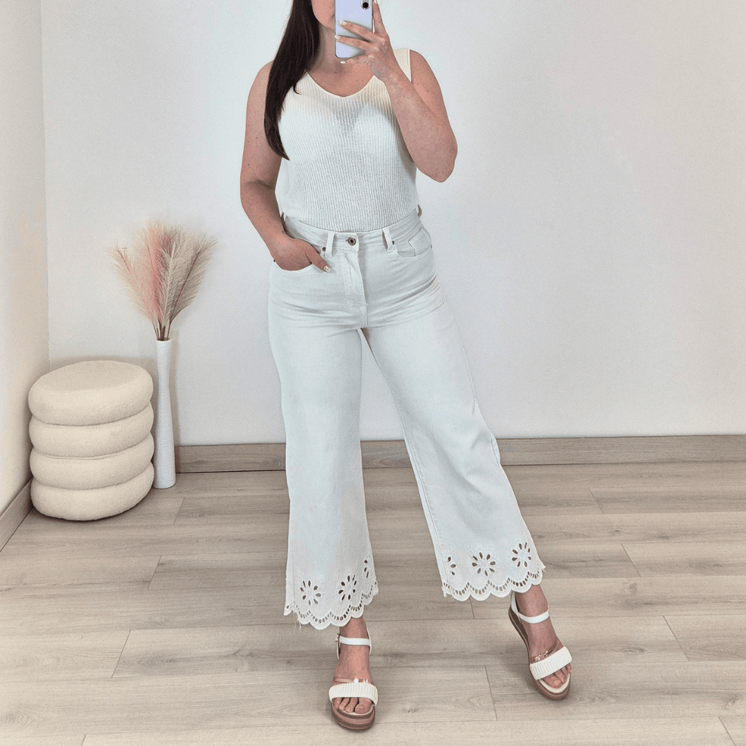 Ženske bombažne hlače. Hlače so elastične ter udobne za nošenje. Hlačnice so v dolžini 7/8, na koncu hlačnic je vezenina, kar daje hlačam poseben izgled. Imajo dva žepa na sprednji strani in dva žepa na zadnji strani. Hlače boste odlično kombinirale s svojimi najljubšimi oblačili.