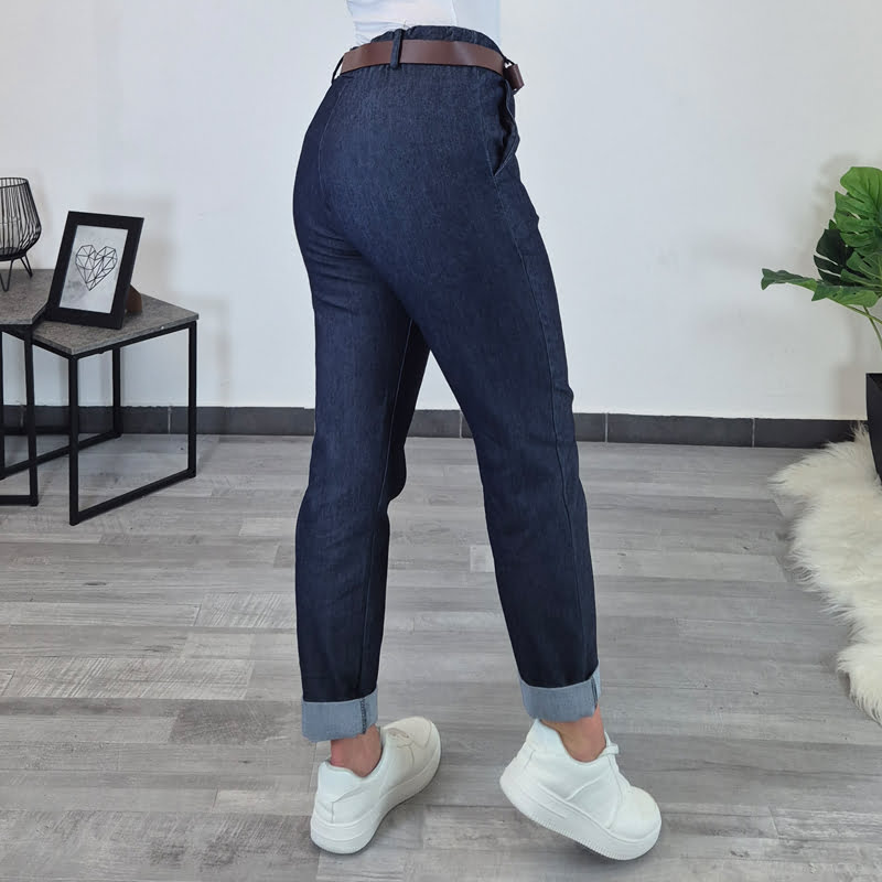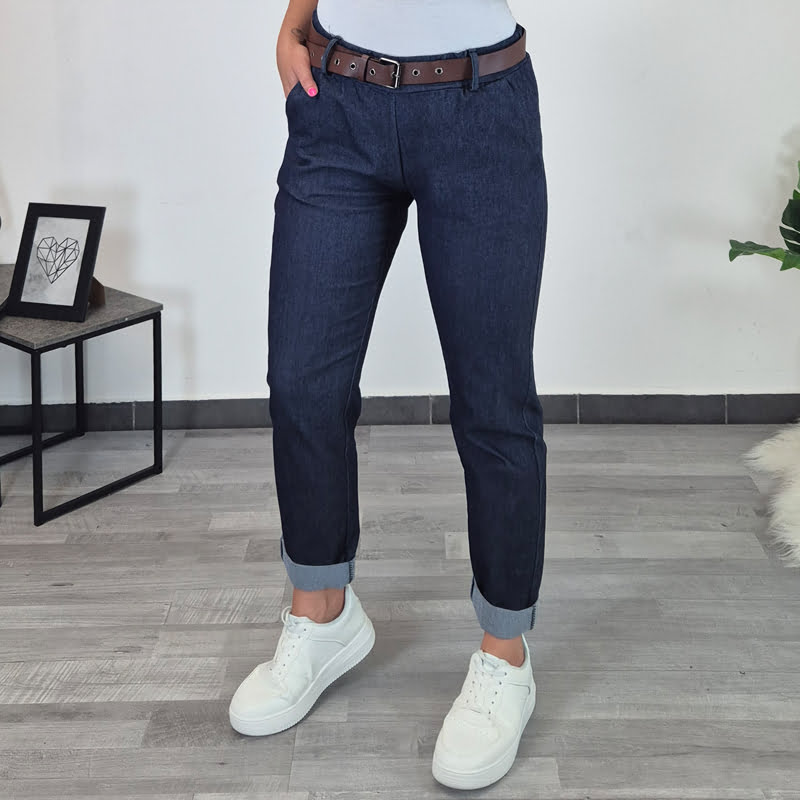Ženske bombažne hlače v izgledu jeansa. Hlače imajo dva stranska žepa, priložen je rjav pas. Hlačnice so dolžine 7/8, po želji jih lahko odvihate. Narejene so iz elastičnega materiala in so udobne.
