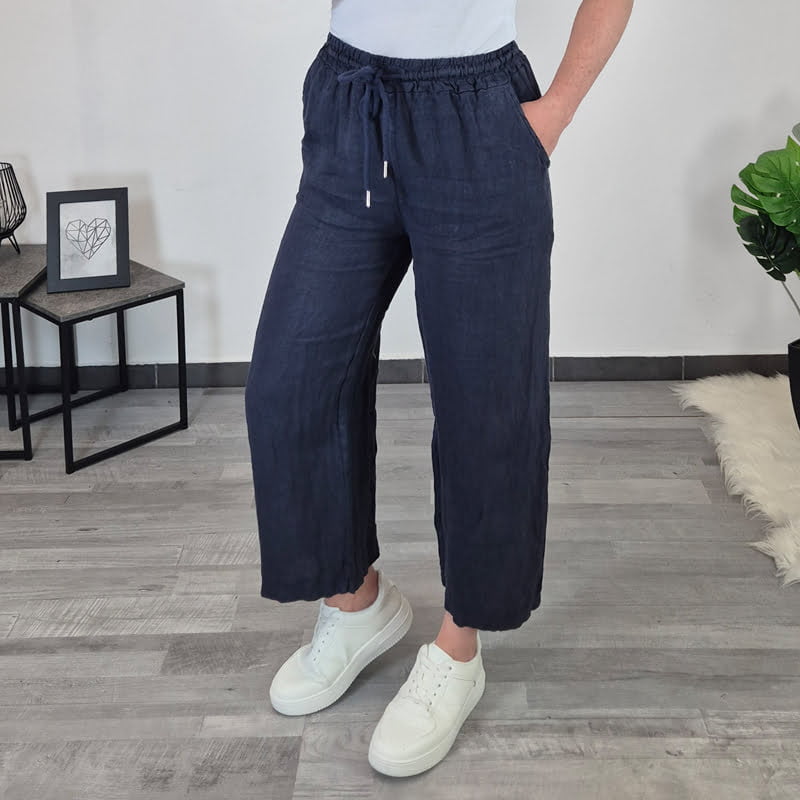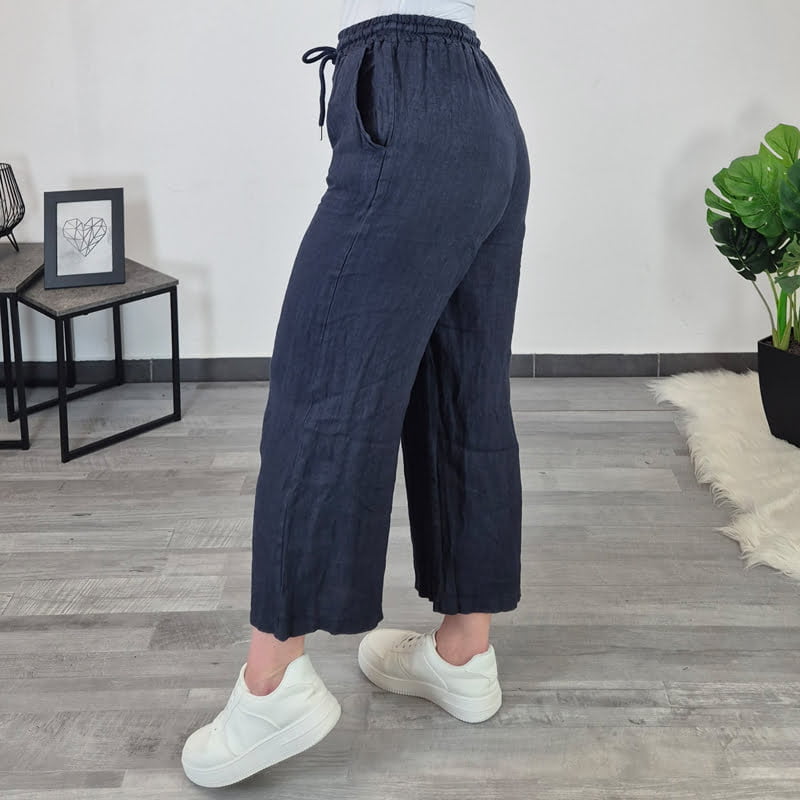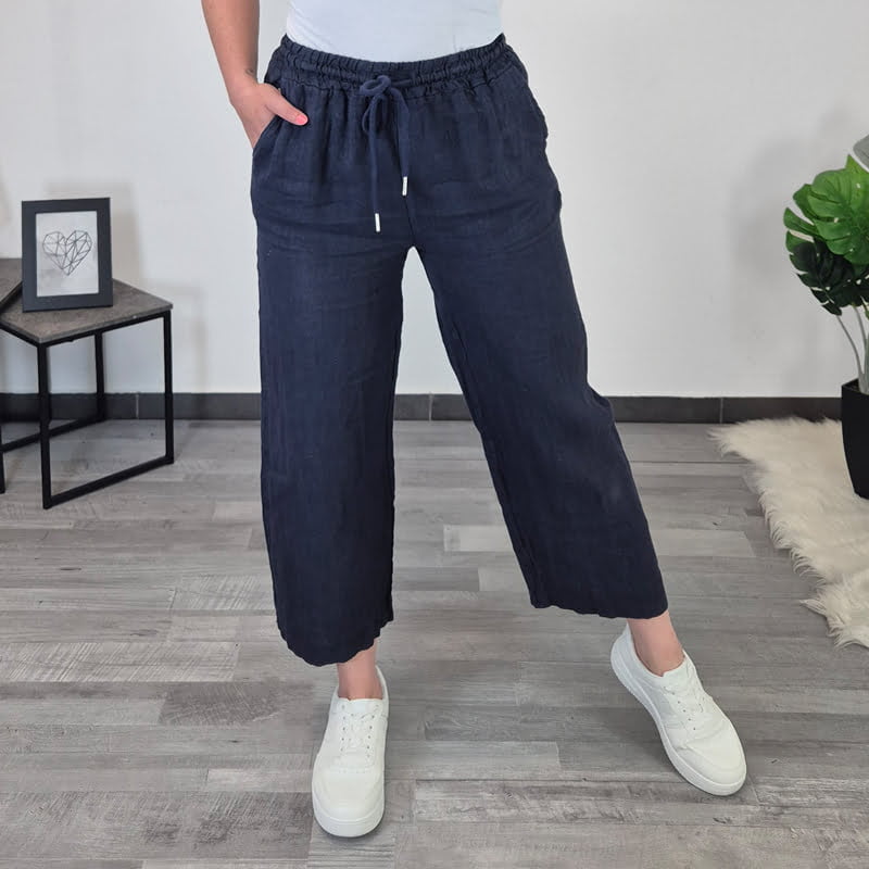 Ženske hlače so izdelane iz 100% lanu in so v temno modri barvi. Hlače so tanke in lahke, primerne za vroče poletne dni. Hlače imajo v pasu elastiko in vrvico, ob straneh imajo dodane žepe, hlačnice so v dolžini 7/8.