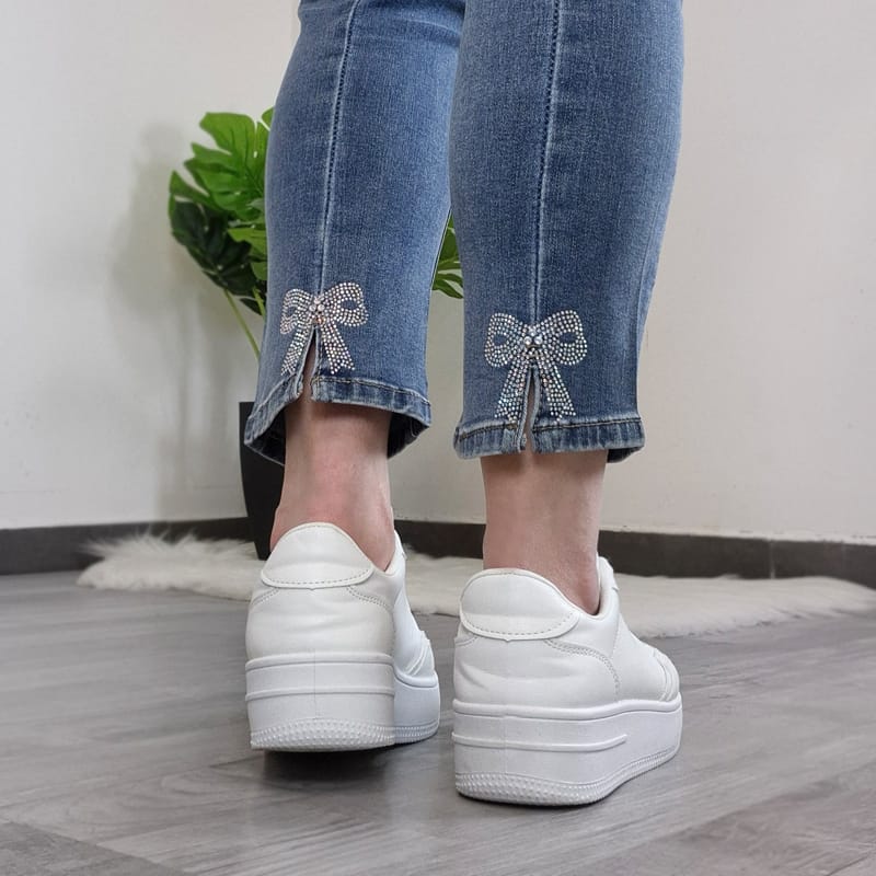 Ženske kavbojke v dolžini 7/8.. Kavbojke so elastične in so zelo udobne za nošenje. Zadnji del hlač je oblikovan tako, da lepo poudari vašo postavo. Na koncu hlačnic je iz biserčkov izdelan metulj. Zapenjajo se z zadrgo in imajo dva žepa na sprednji strani in dva žepa na zadnji strani. Jeans hlače boste odlično kombinirale s svojimi najljubšimi oblačili.