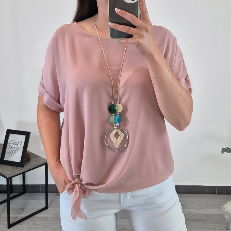 Elegantna ženska majica s kratkimi rokavi. Bluza je narejena iz dveh delov, spodaj ima bel viskozni top, zgoraj pa je dodano lepo blago v roza barvi. Bluza se ob strani zaveže. Velikost je univerzalna, primerna za M, L, XL in XXL.