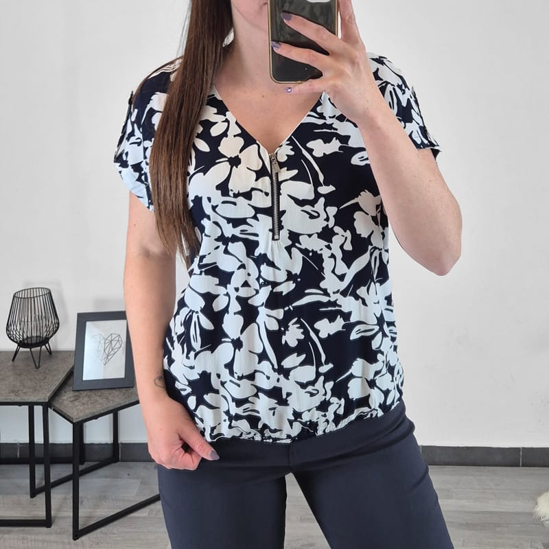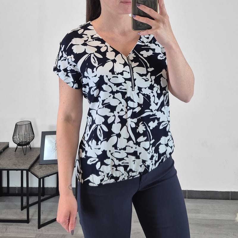 Ženska viskozna bluza v kombinaciji temno modre in bele barve. Bluza ima kratka rokava in V izrez, dodana je še zadrga. Na koncu je zaključena z elastiko. Na voljo od velikosti 36 do 46.