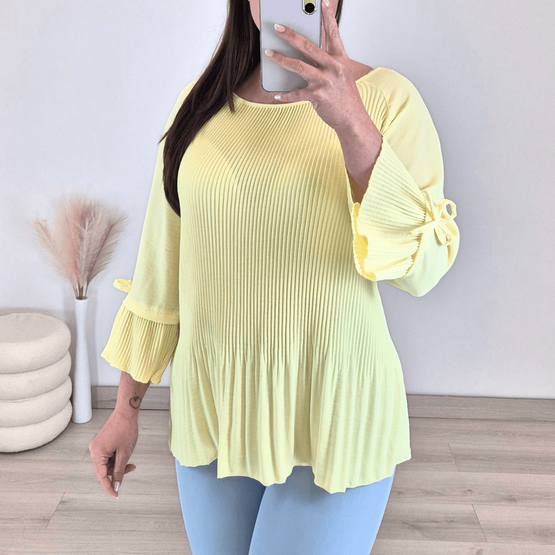 Ženska elegantna bluza v rumena barvi. Bluza je izdelana iz plise materiala. Rokava so gladka, dolžine 3/4, na koncu je dodana mašnica. Na zadnji strani ovratnika je razporek z gumbom. Velikost je univerzalna, primerna za velikosti S do 3XL.