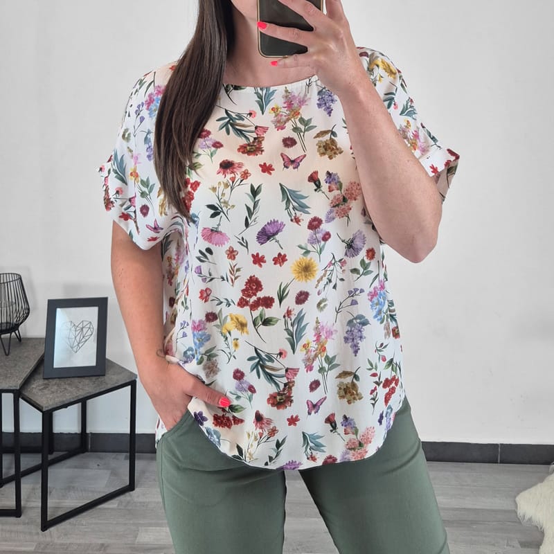 Ženska bluza s cvetličnim vzorcem v različnih barvah, primerna za kombinacije na vse enobarvne hlače. Bluza ima kratka rokava, kroj je širši in lepo pade. Izdelana je iz viskoze, je tanka in zračna, primerna tudi za poletne vroče dni. Velikost je univerzalna, primerna za velikosti od S do XL.
