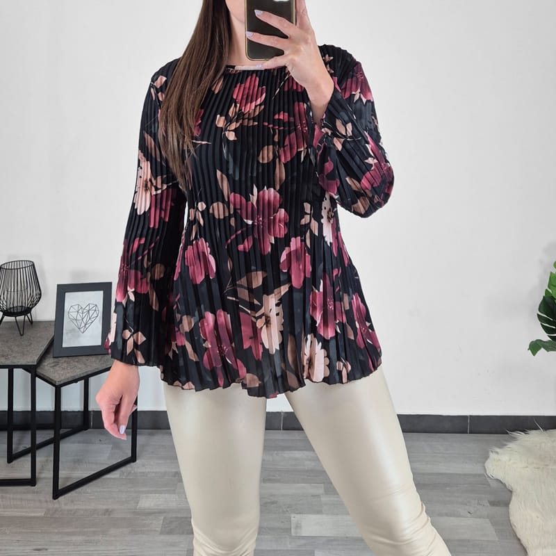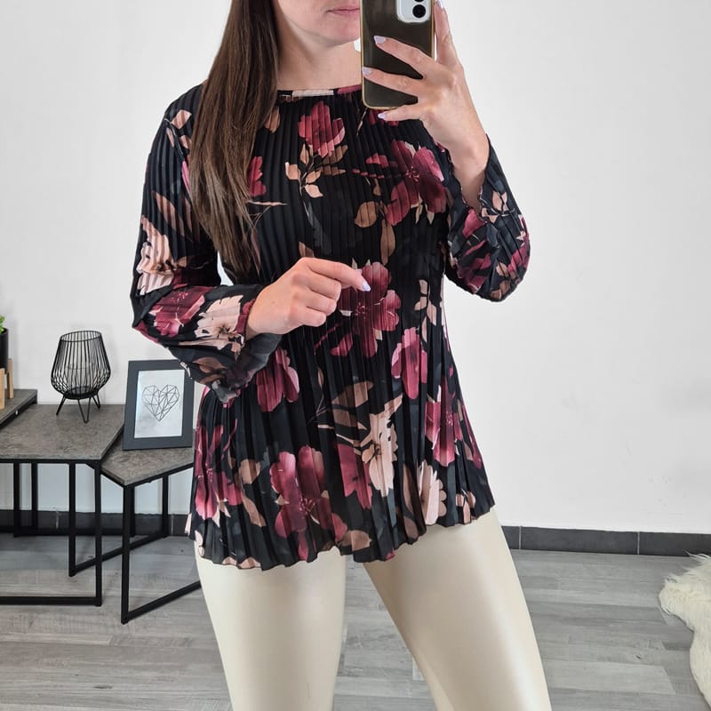 Elegantna ženska majica z dolgimi rokavi. Bluza je izdelana iz plise materiala v črni barvi s cvetlicami. Kroj bluze je raven. Velikost je univerzalna, primerna za S do XL.