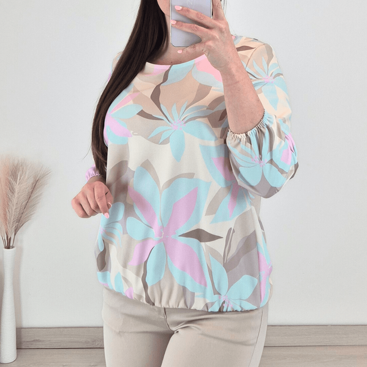 Ženska elegantna majica. Narejena je iz mešanice bombaža in je prijetna za nošenje. Kroj je širši, zaključi se s patentom na elastiko, ki majico oblikuje. Ima 7/8 rokava. Majica je narejena iz vzorčastega blaga v bež, svetlo modri in roza kombinaciji. Velikosti so od 38 do 48.