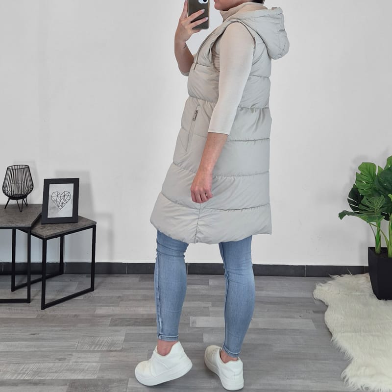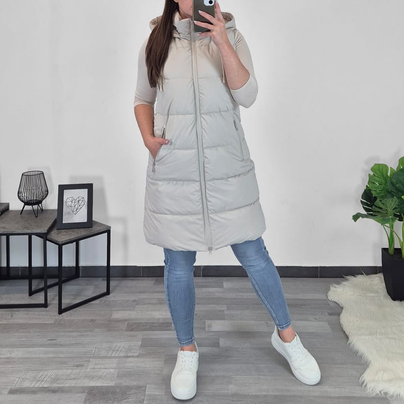 Ženski prešiti brezrokavnik v mat bež barvi. Brezrokavnik se po celotni dolžini zapenja z zadrgo, prav tako se z zadrgo zapenjata tudi stranska žepa. Brezrokavnik ima kapuco. Na voljo je od velikosti S do L.