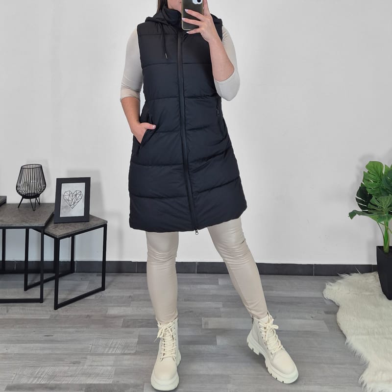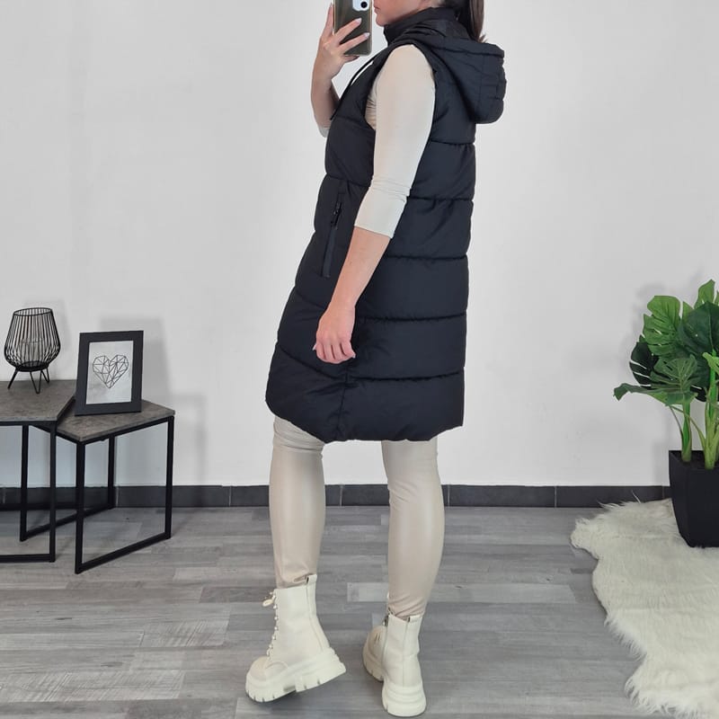 Ženski prešiti brezrokavnik v mat črni barvi. Brezrokavnik se po celotni dolžini zapenja z zadrgo, prav tako se z zadrgo zapenjata tudi stranska žepa. Brezrokavnik ima kapuco. Na voljo je od velikosti S do L.
