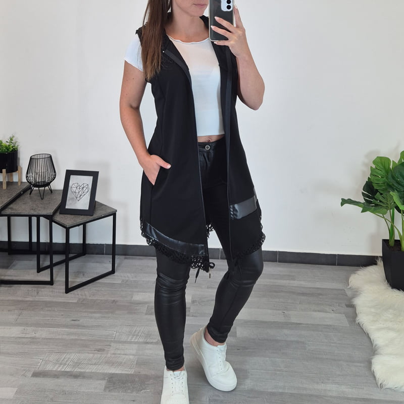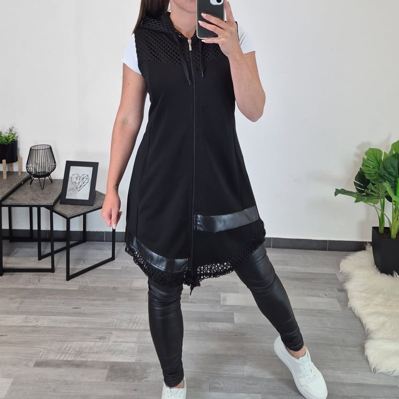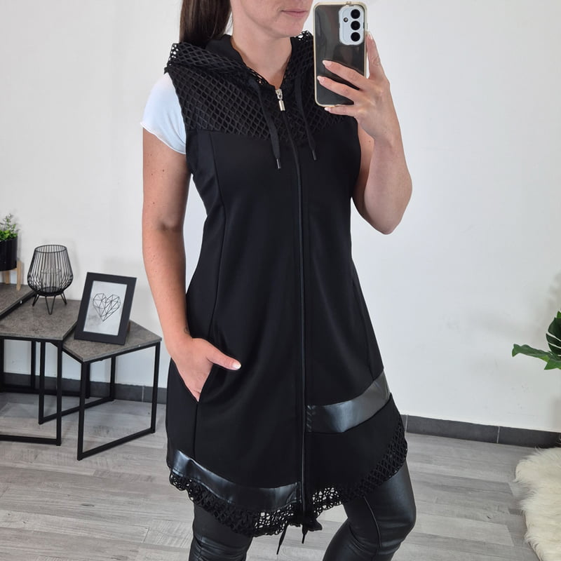 Ženski bombažni brezrokavnik Alba v črni barvi. Brezrokavnik ima dva stranska žepa, kapuco in se po celi dolžini zapira z zadrgo.. Na sprednji strani mu je dodano še blago v imitaciji usnja in črna mrežica, ki je kombinirana tudi na kapuci. Na voljo je od številke 38 do 52.