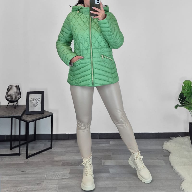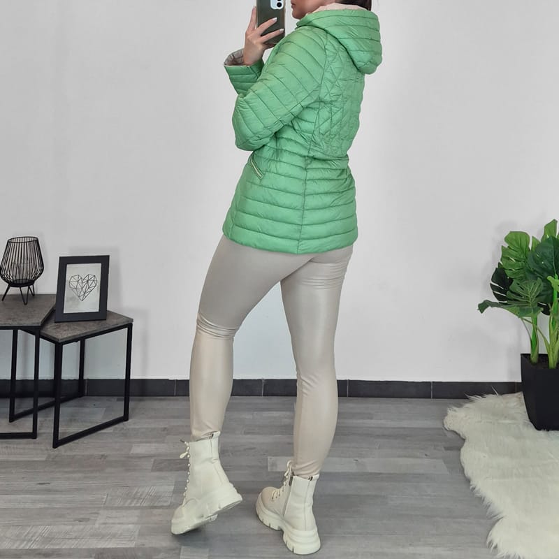 Ženska tanjša bunda v zeleni barvi s kapuco, kapuca je snemljiva. Bunda je srednje dolžine in sega preko bokov. Po celotni dolžini se zapenja z zadrgo, prav tako se z zadrgo zapenjajo vsi žepi. Bunda je na voljo od velikosti M do 4XL.