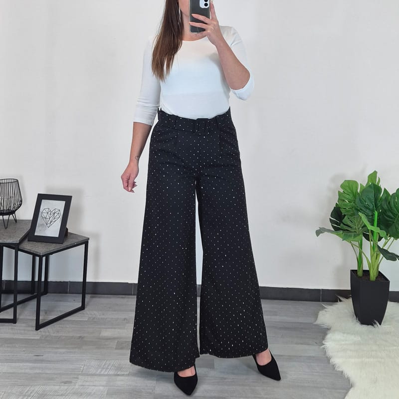 Ženske elegantne hlače v črni barvi s srebrnimi kamenčki. Hlače imajo visok pas, hlačnice so široke in dolge. Na sprednji strani imajo dva stanska žepa. Hlače so zelo elastične in udobne za nošenje. Dodan je še črn pas. Velikost je univerzalna, primerna za S, M.