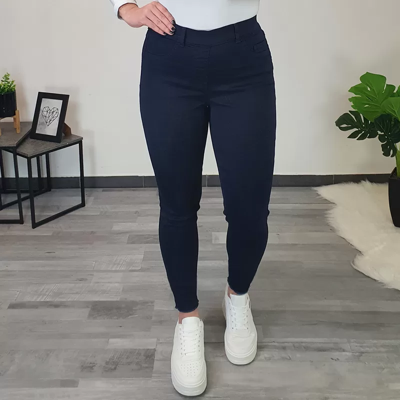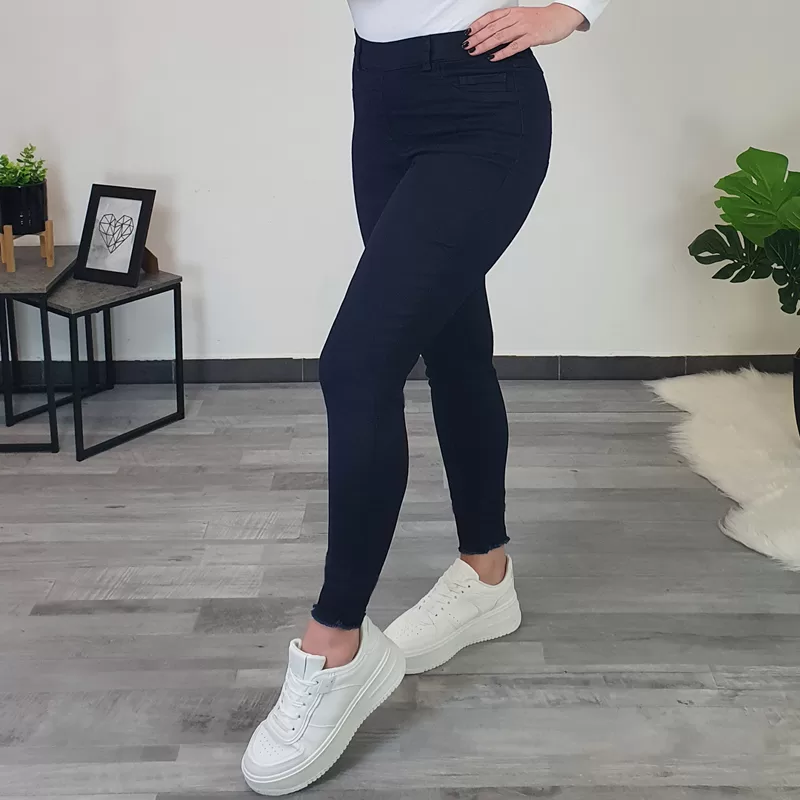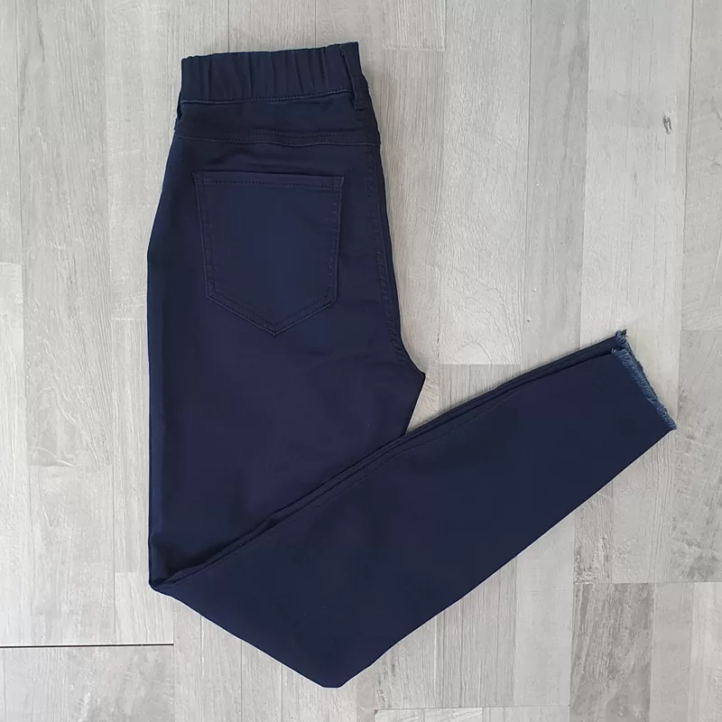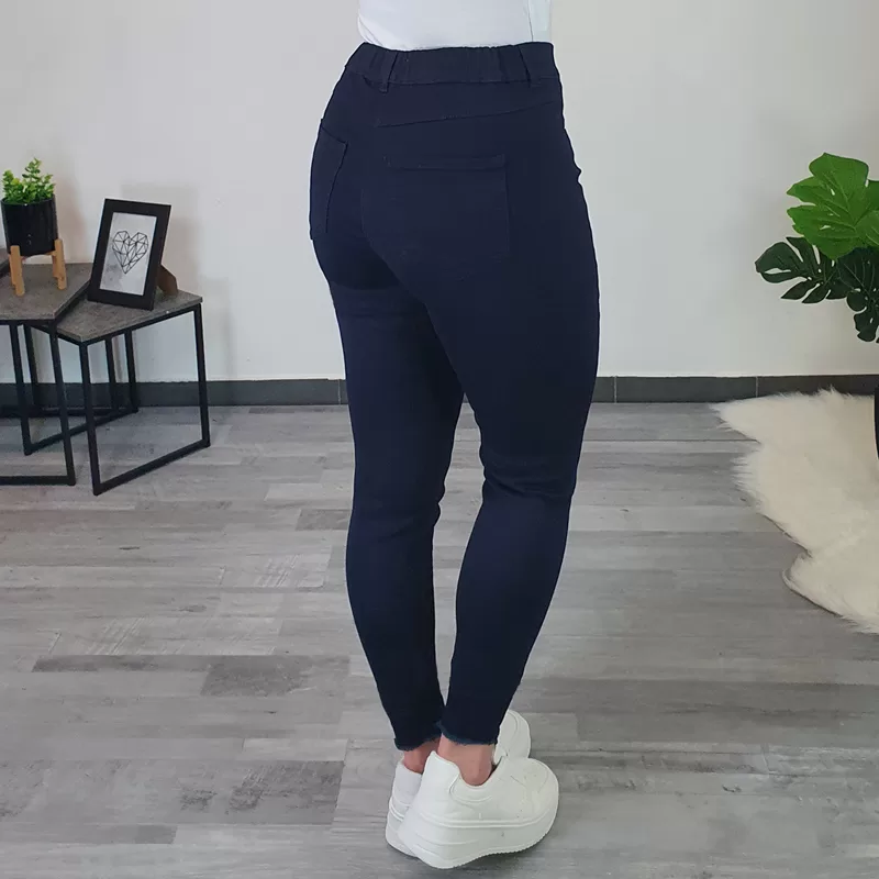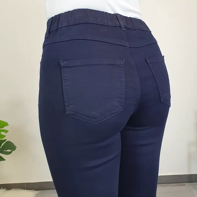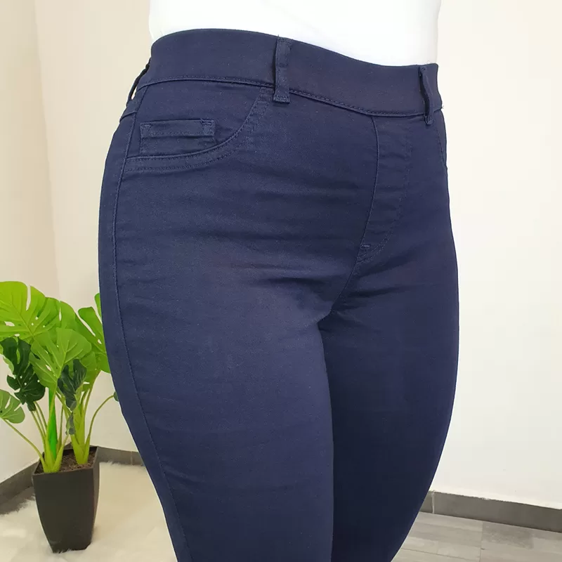 Modne hlače na elastiko v temno modri barvi. Hlače so izdelane iz kvalitetne mešanice bombaža in poliestra, so zelo elastične in izjemno udobne za nošenje. Hlače so v pasu z elastiko, imajo dva stranska žepa in dva žepa na zadnji strani. Hlačnice so dolge in ozke. Na voljo so od številke 36 do 46.