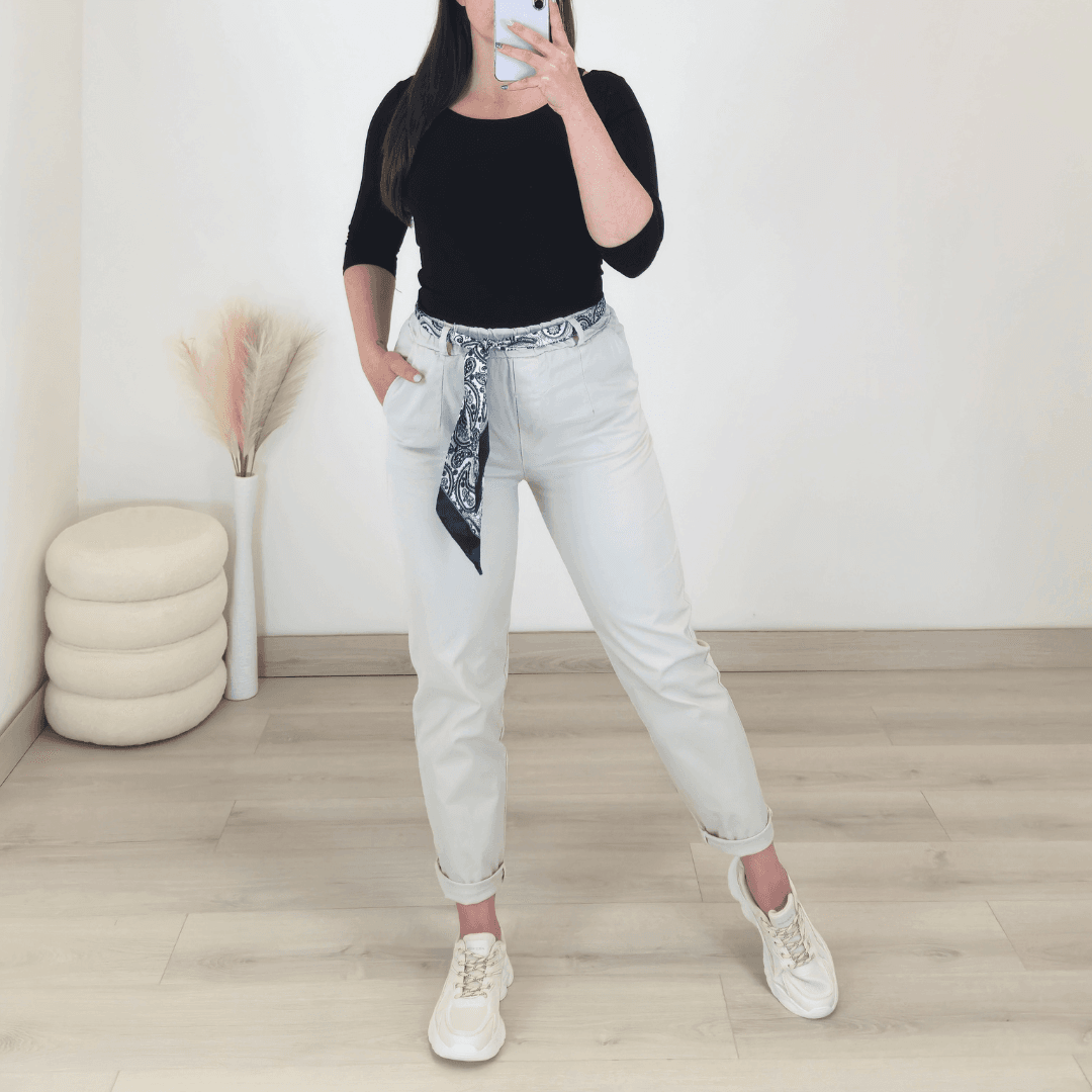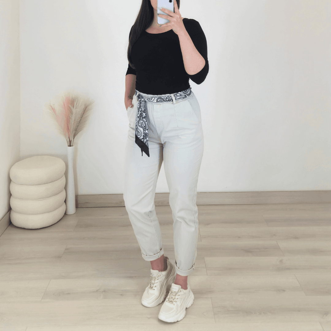 Ženske modne hlače v bež barvi. Hlače imajo višji pas z elastiko in dva stranska žepa. Dodan je dekorativni pas. Hlače so izdelane iz bombaža in so zelo udobne za nošenje.