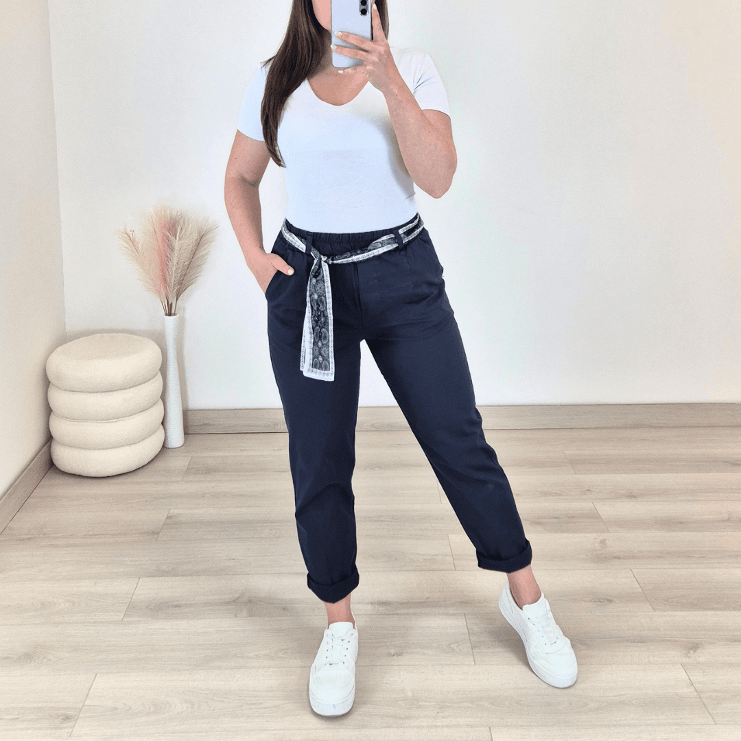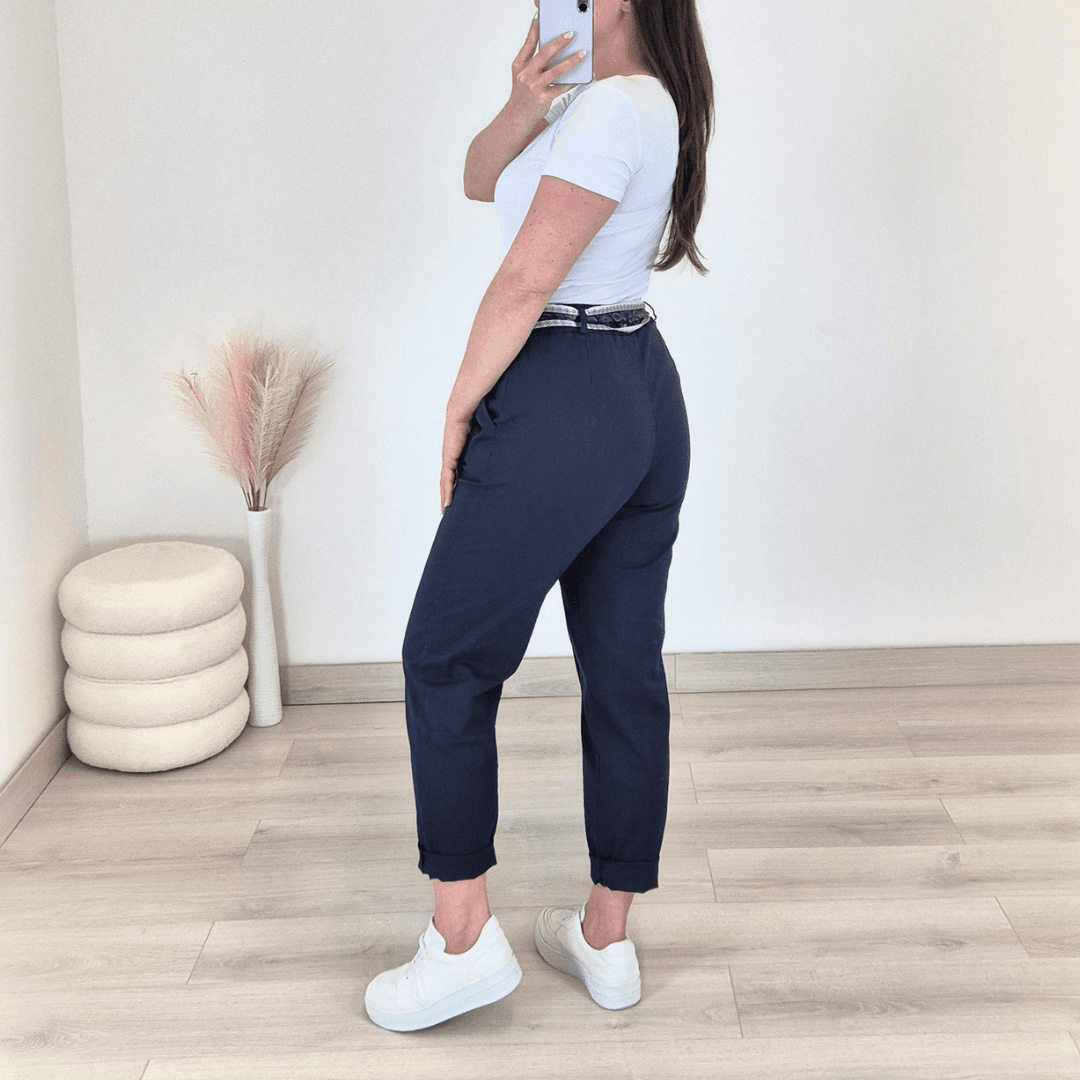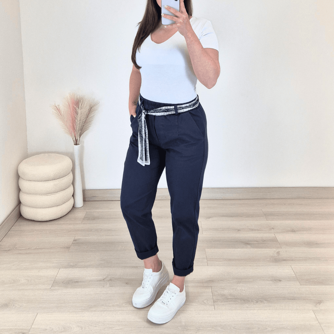 Ženske modne hlače v temno modri barvi. Hlače imajo višji pas z elastiko in dva stranska žepa. Dodan je dekorativni pas. Hlače so izdelane iz bombaža in so zelo udobne za nošenje.