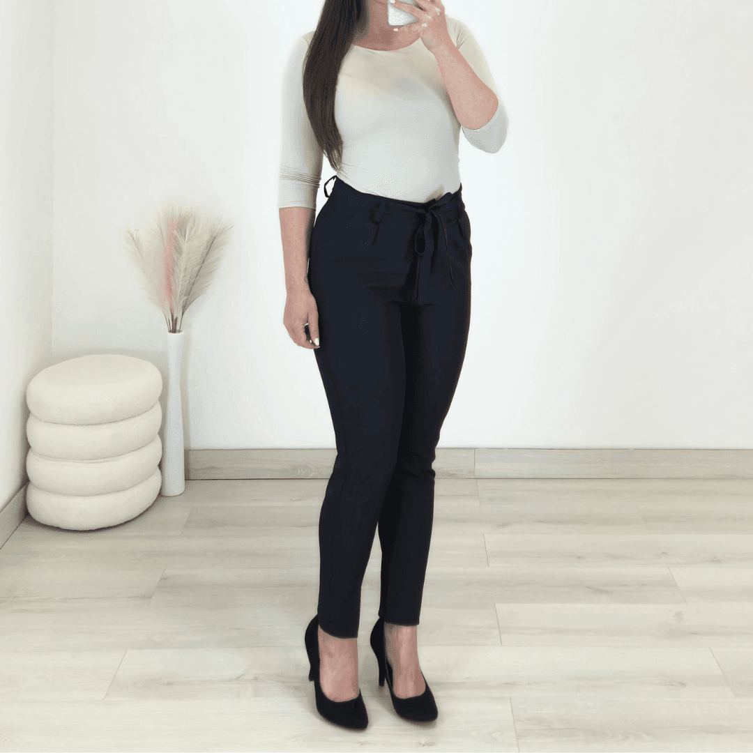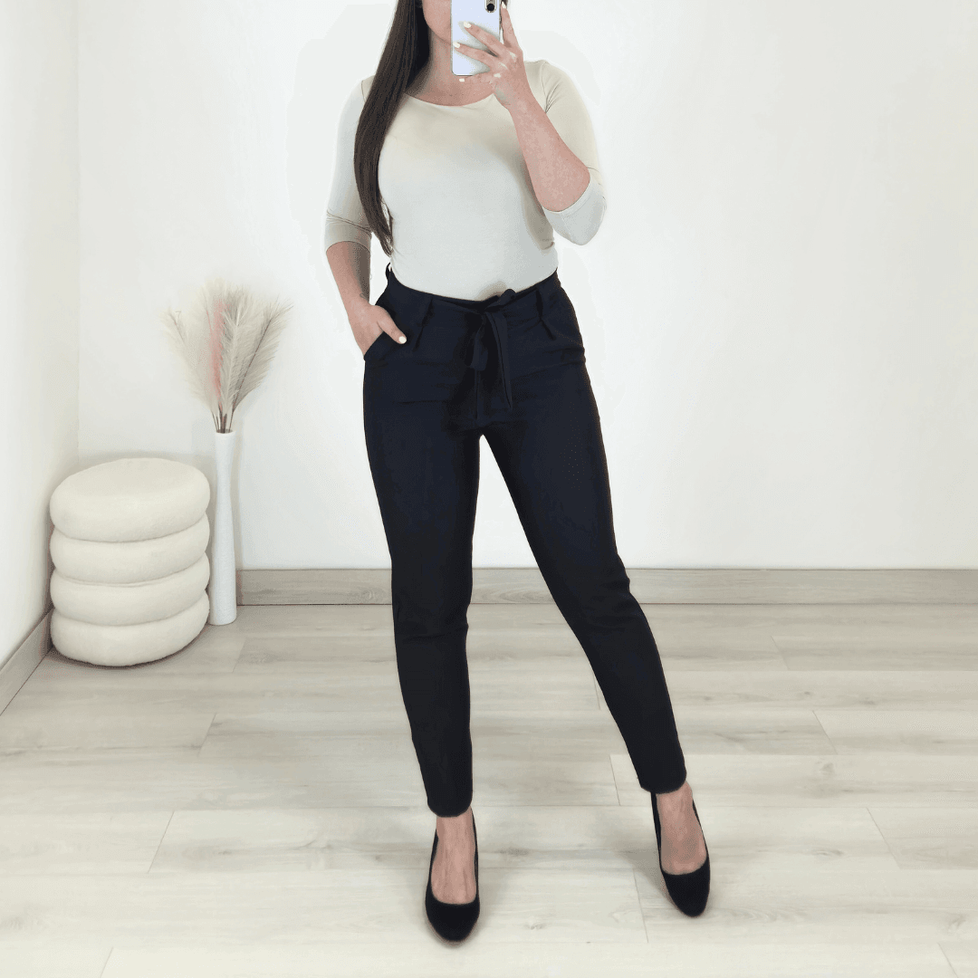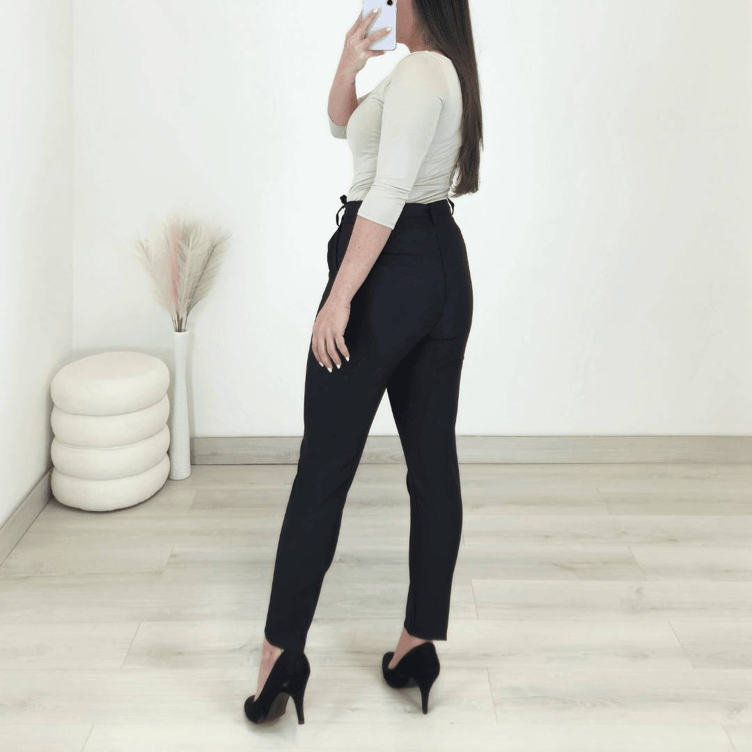 Ženske elegantne hlače v črni barvi s pasom. Hlače imajo visok pas, hlačnice so spodaj ožje. Spredaj imajo dva stanska žepa, zadaj je žep samo nakazan. Na voljo od številke S do XL.