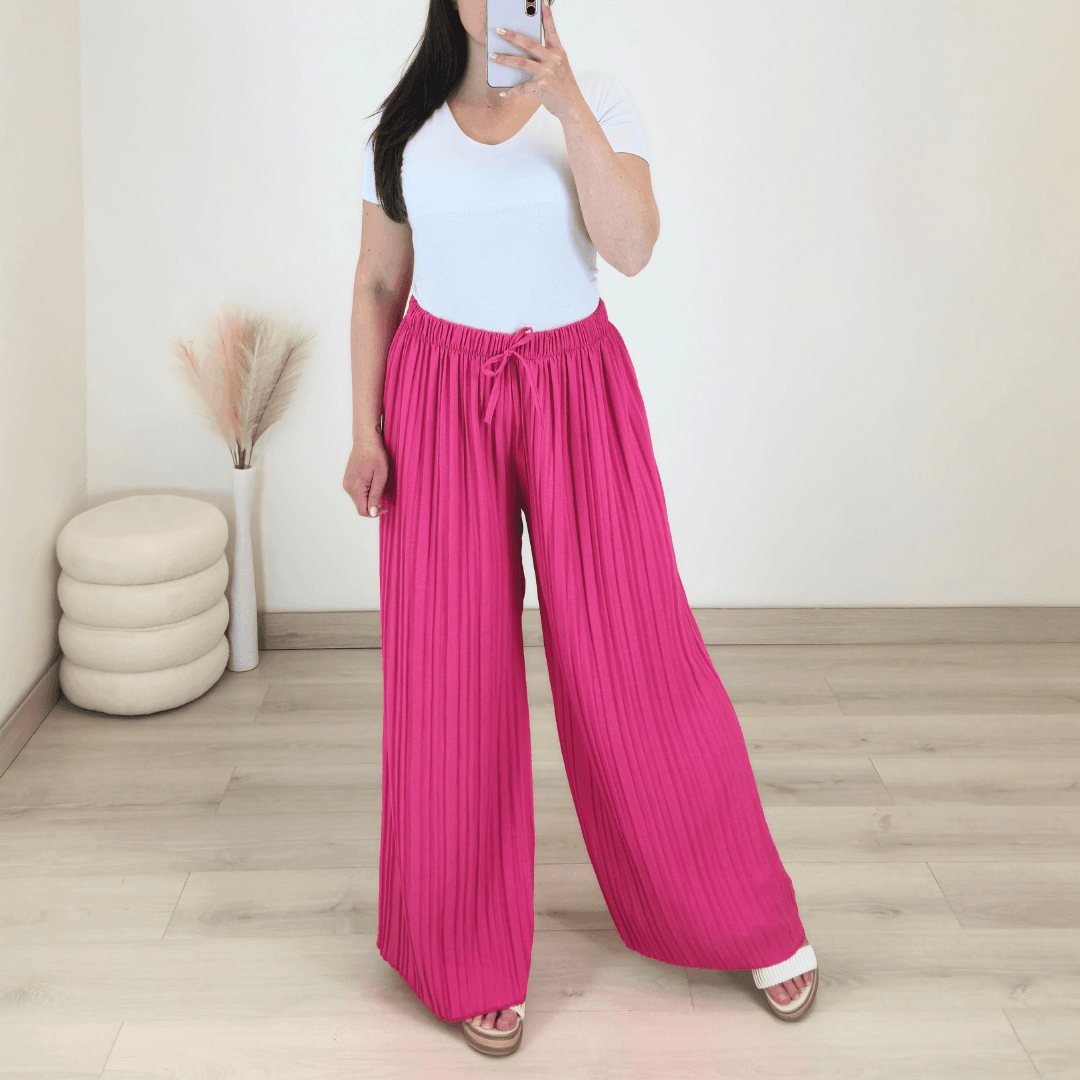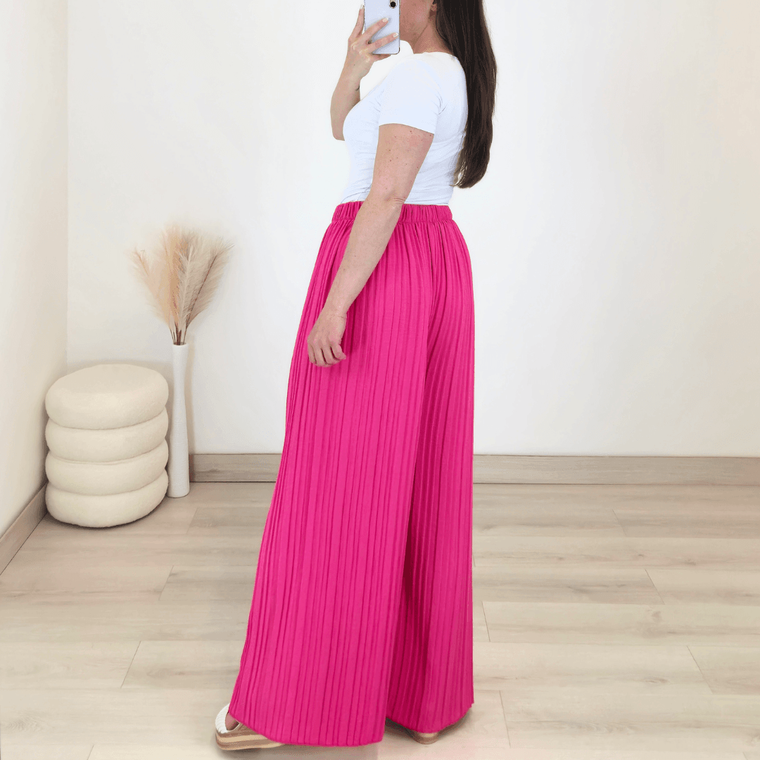 Modne ženske široke hlače v roza barvi. Hlače imajo višji pas, hlačnice so dolge, široke in plisirane. Velikost je univerzalna, primerne so za XS do 3XL.