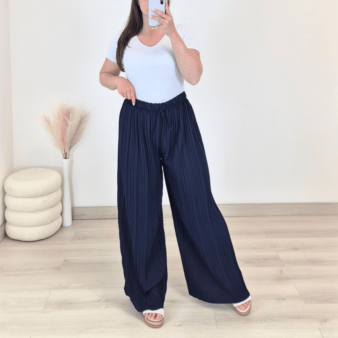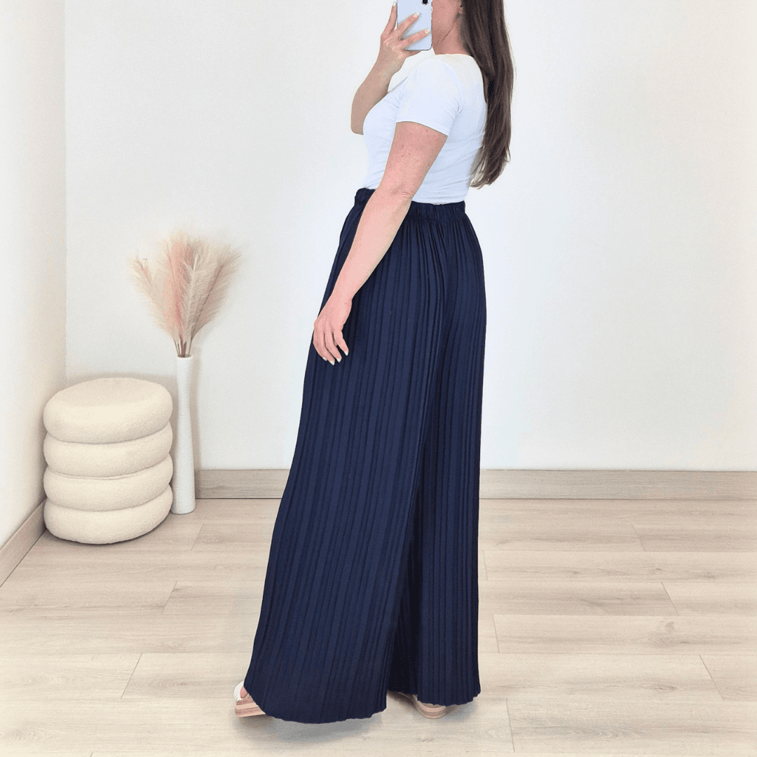Modne ženske široke hlače v temno modri barvi. Hlače imajo višji pas, hlačnice so dolge, široke in plisirane. Velikost je univerzalna, primerne so za XS do 3XL.