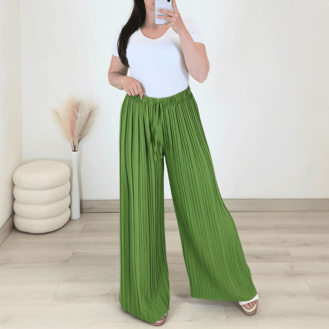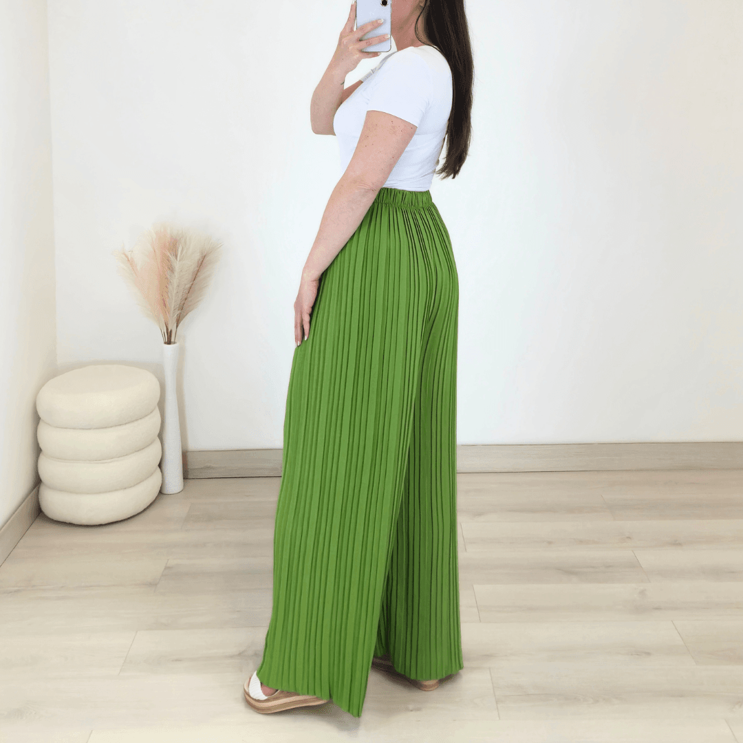 Modne ženske široke hlače v zeleni barvi. Hlače imajo višji pas, hlačnice so dolge, široke in plisirane. Velikost je univerzalna, primerne so za XS do 3XL.