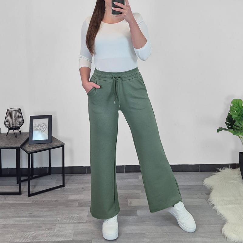 Ženske hlače Banu 7/8 v olivno zeleni barvi. Hlače imajo višji pas na elastiko in vrvico, imajo dva stranska žepa, hlačnice so širše in ravne. Zaradi mešanice modala so hlače izredno mehke. Na voljo so od številke XS do XL.