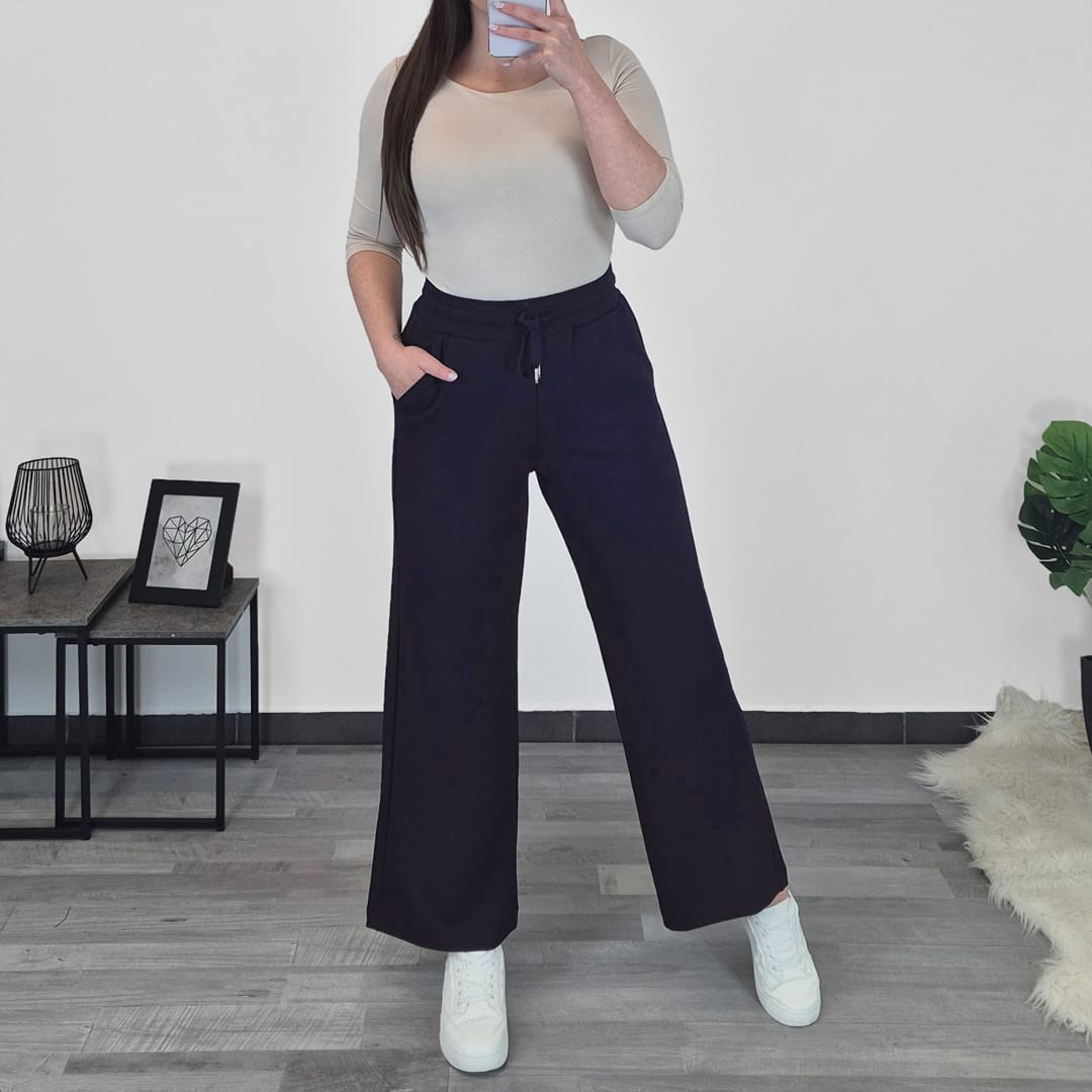 Ženske hlače Banu v temno modri barvi v dolžini 7/8. Hlače imajo višji pas na elastiko in vrvico. Imajo dva stranska žepa, hlačnice so širše in ravne. Zaradi mešanice modala so hlače izredno mehke. Na voljo so od številke S do XXL.
