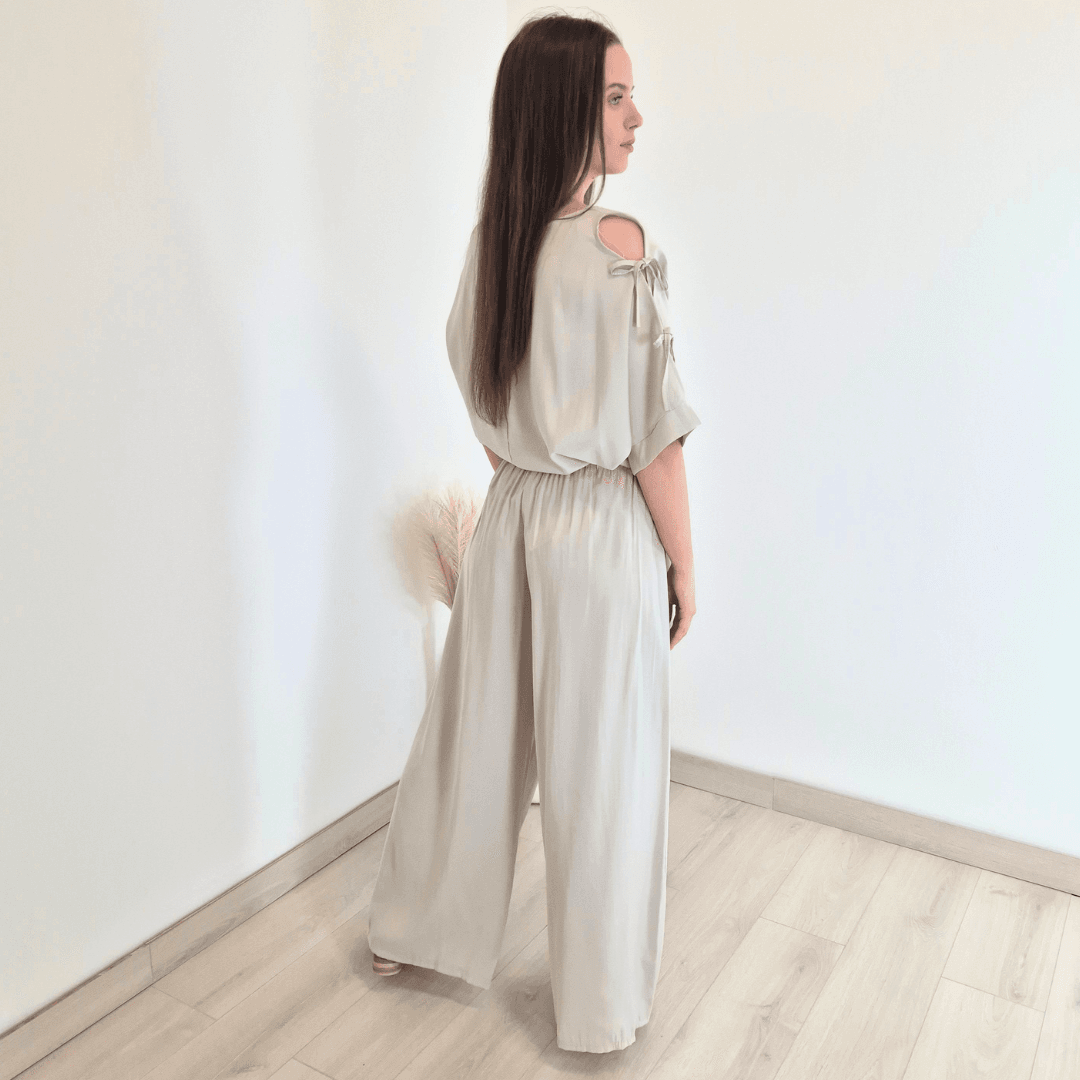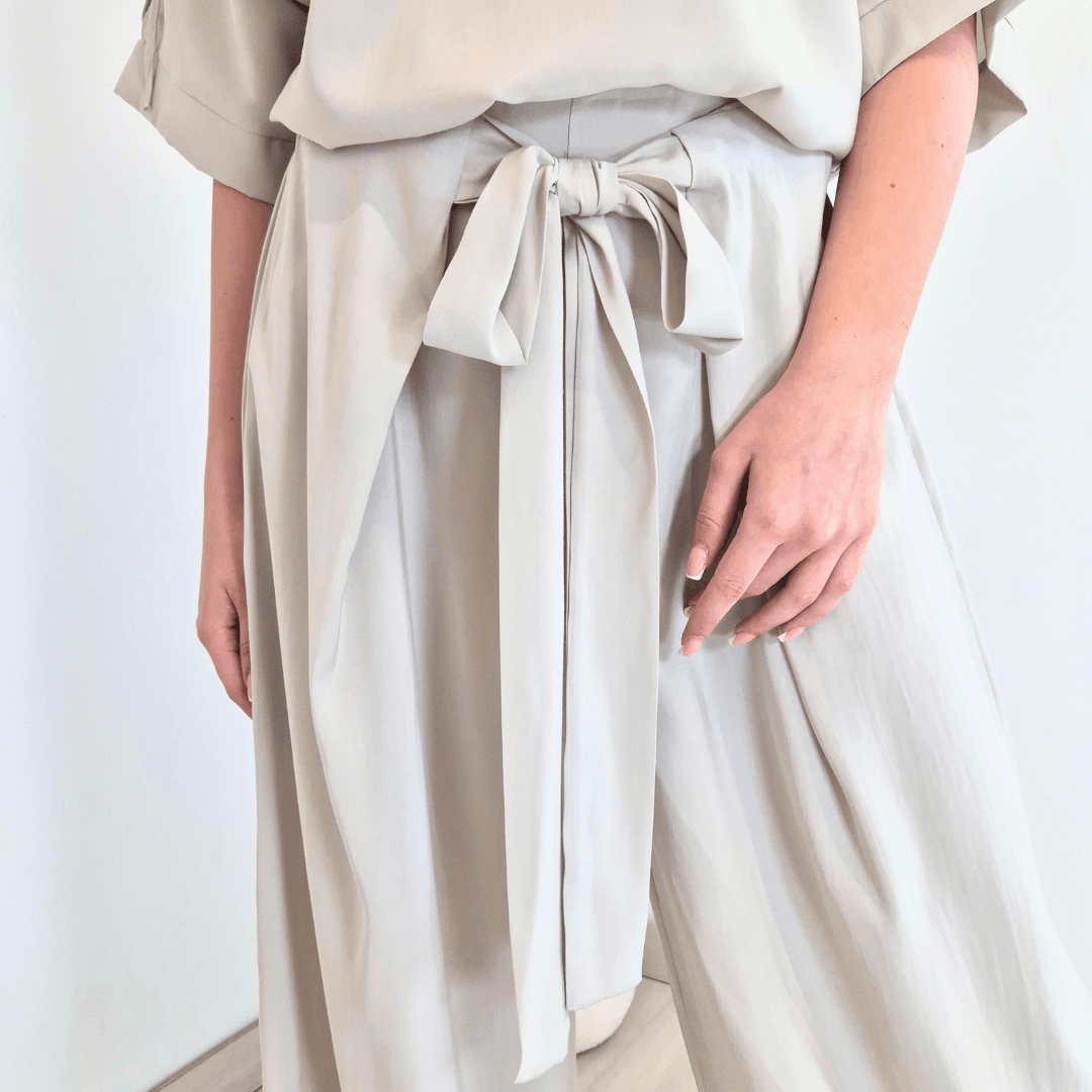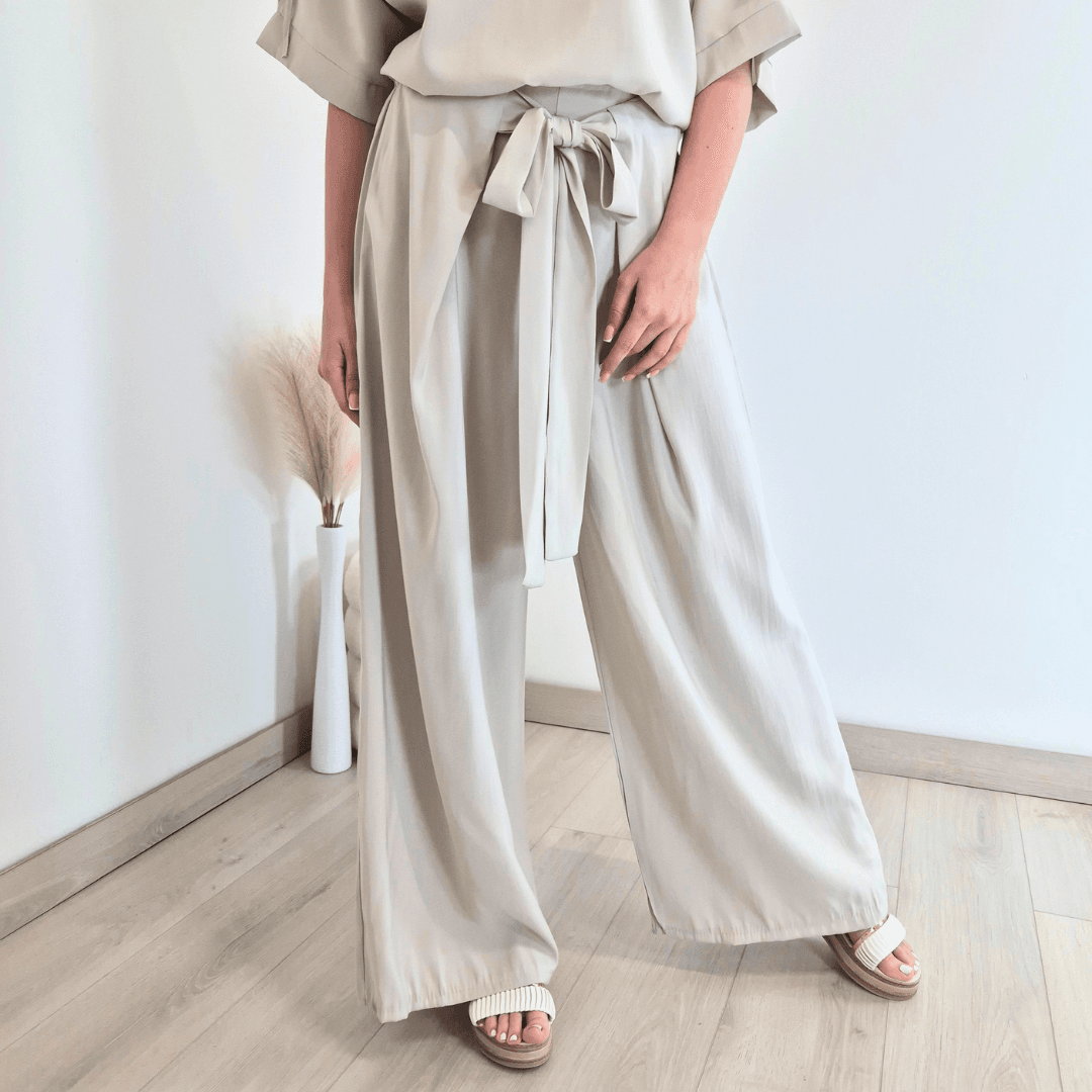 Modne ženske hlače v bež barvi. Hlače imajo višji pas, ki ima na zadnji strani elastiko, na sprednji strani se lepo zavežejo s trakovi. Hlačnice so dolge in široke. Izdelane so iz lahkega in tankega materiala, so odlična izbira za poletne dni. Velikost je univerzalna, primerna za S do L.