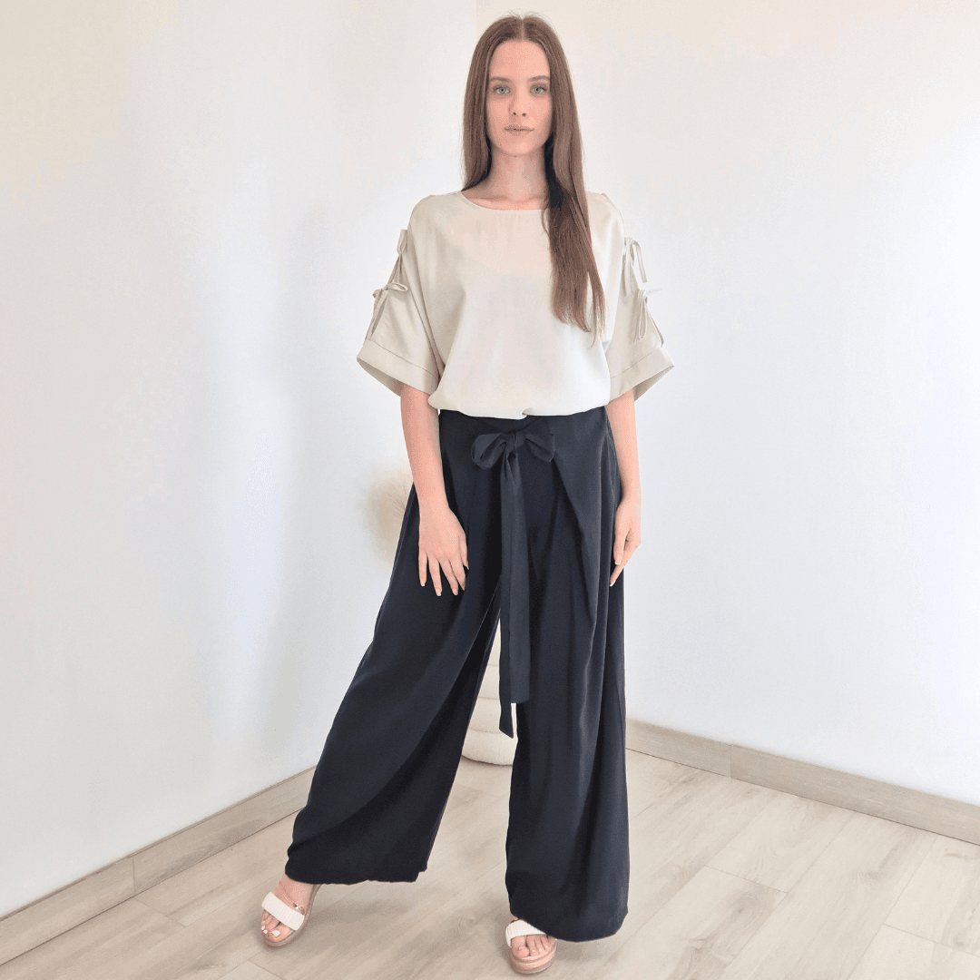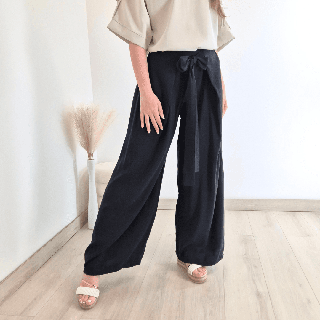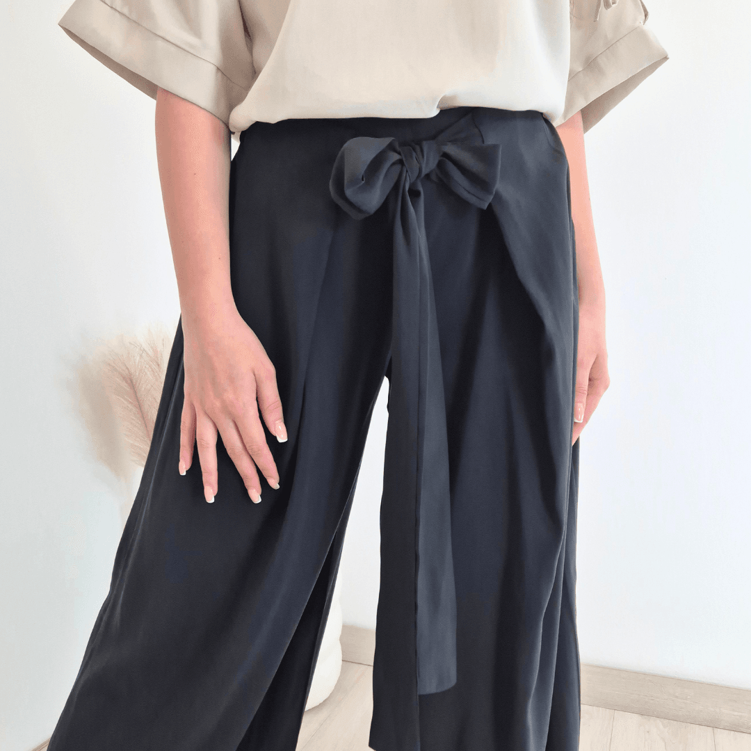 Modne ženske hlače v črni barvi. Hlače imajo višji pas, ki ima na zadnji strani elastiko, na sprednji strani se lepo zavežejo s trakovi. Hlačnice so dolge in široke. Izdelane so iz lahkega in tankega materiala, so odlična izbira za poletne dni. Velikost je univerzalna, primerna za S do L.