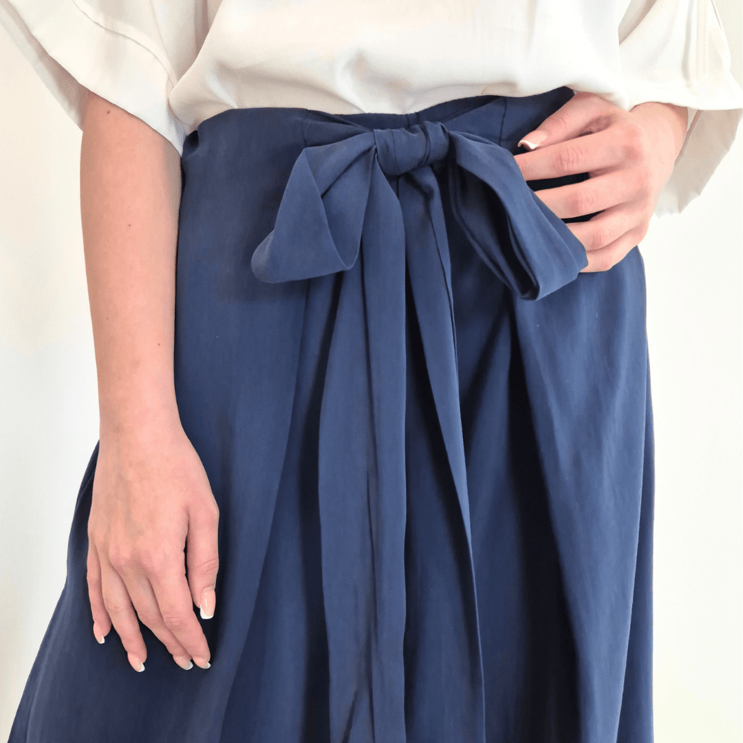 Modne ženske hlače v temno modri barvi. Hlače imajo višji pas, ki ima na zadnji strani elastiko, na sprednji strani se lepo zavežejo s trakovi. Hlačnice so dolge in široke. Izdelane so iz lahkega in tankega materiala, so odlična izbira za poletne dni. Velikost je univerzalna, primerna za S do L.