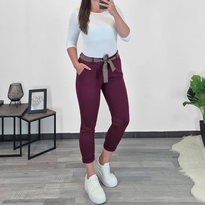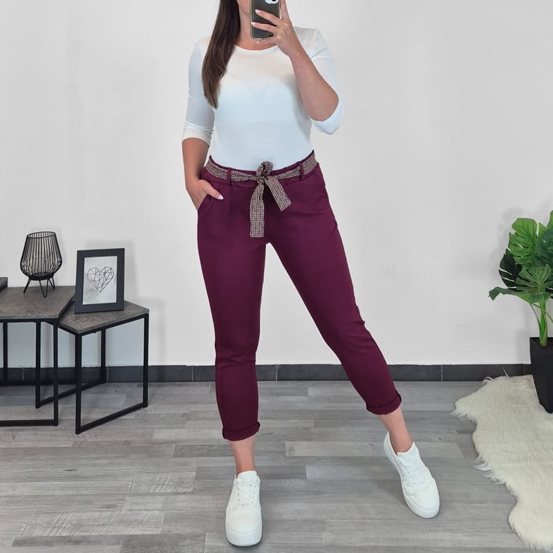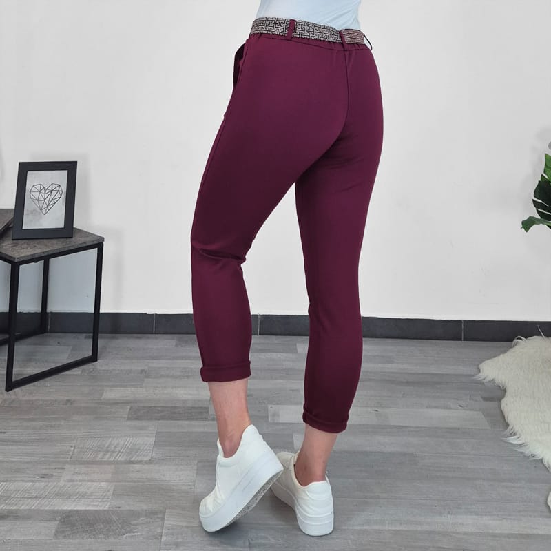 Ženske hlače z elastiko v pasu. Hlače so zelo elastične, so v bordo rdeči barvi, imajo dva stranska žepa, dodan je pas, ki se zaveže. Hlačnice se lahko zavihajo v 7/8.