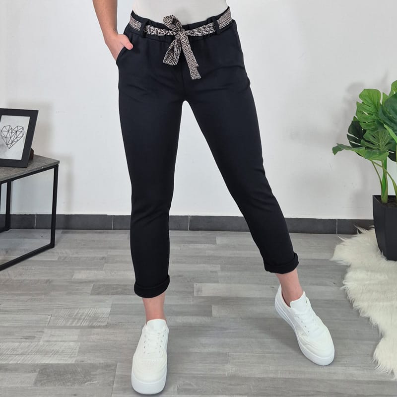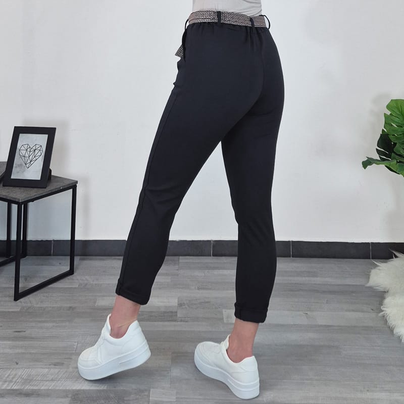 Modne ženske hlače v črni barvi. Hlače imajo višji pas, hlačnice so oprijete in dolge, lahko jih zavihate tudi v 7/8 . Na sprednji strani imajo dva stanska žepa. Hlače so zelo elastične in udobne za nošenje. Dodan je še pas.