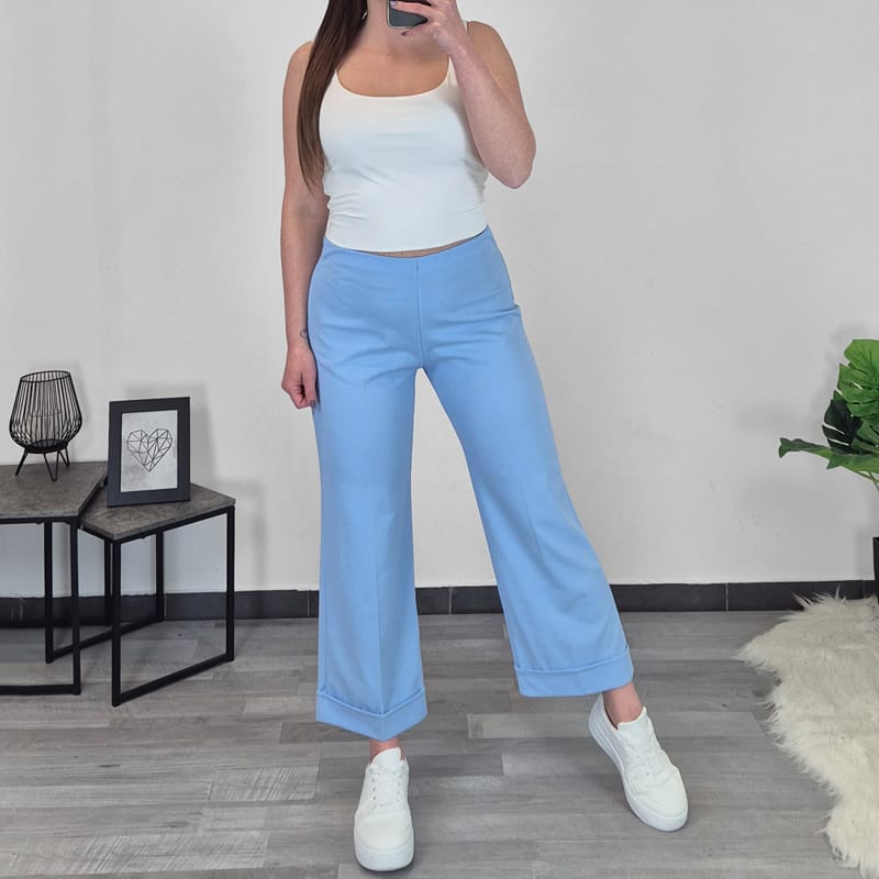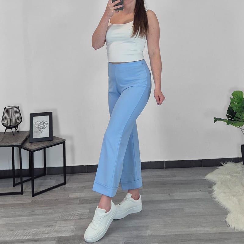 Ženske hlače z elastiko v pasu. Hlače so zelo elastične in so v svetlo modri barvi. Ob strani se zapirajo z zadrgo. Hlače imajo visok pas. So mehke na otip in zato lepo padejo in so prijetne za nošenje. Hlačnice so v dolžini 7/8 in imajo na koncu zavihan rob. Velikost hlač je od S do XL.