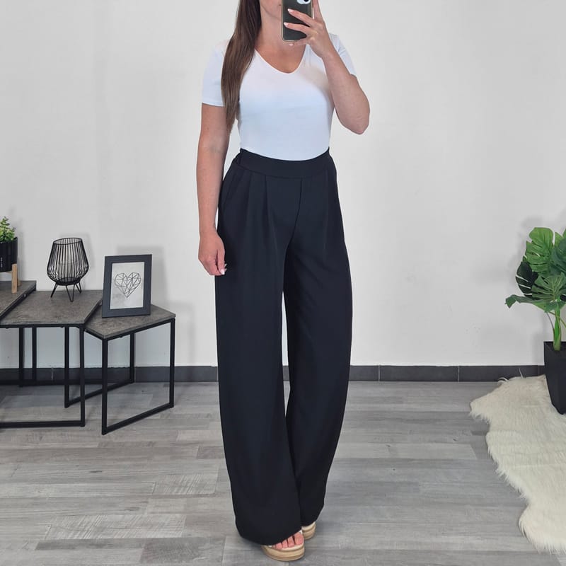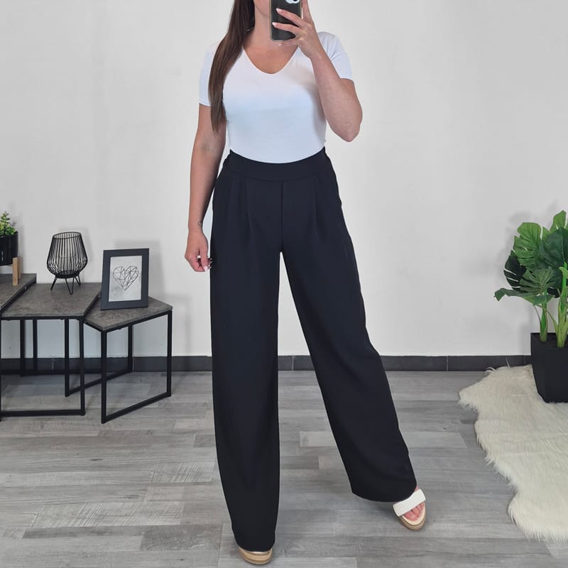 Ženske dolge poletne hlače v črni barvi. Hlače imajo visok elastičen pas. Hlače so mehke na otip, lepo padejo in so prijetne za nošenje. Hlačnice so dolge in široke. Na voljo v velikostih S,M, L.