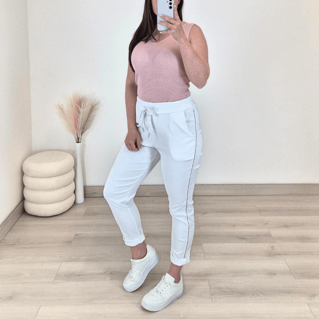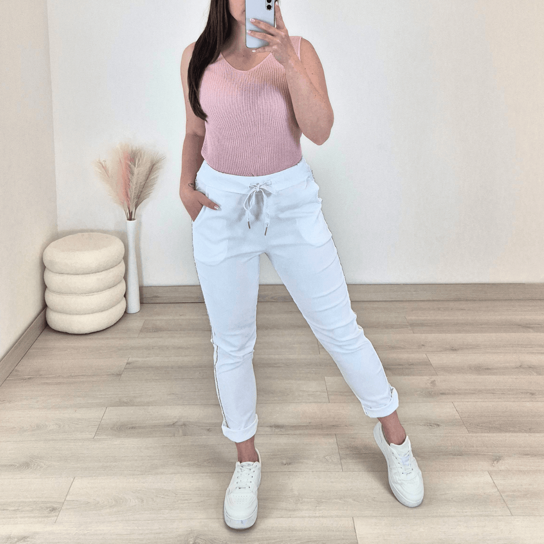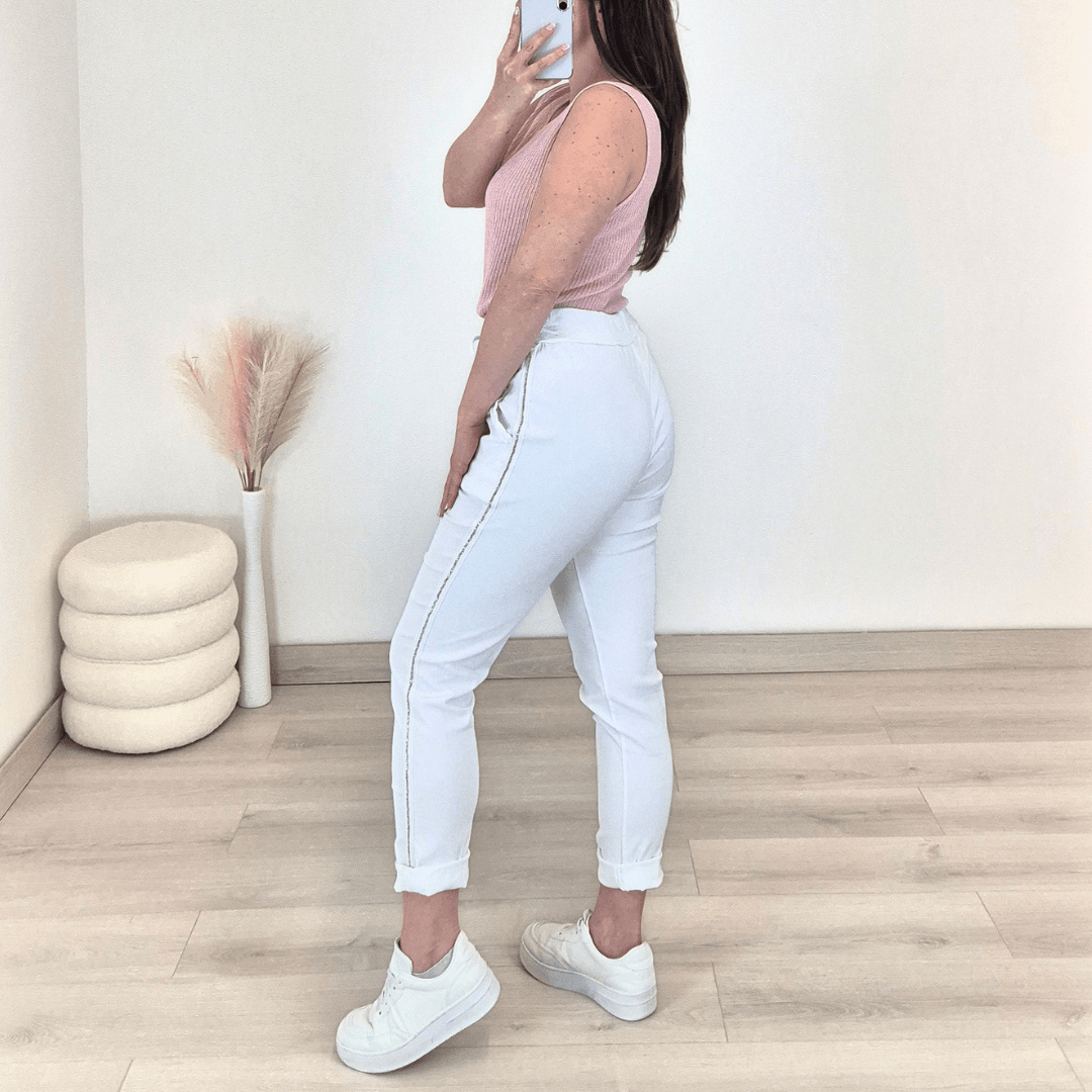 Ženske hlače v beli barvi. Hlače imajo višji pas, hlačnice so dolge, lahko jih zavihate tudi v 7/8. Hlačnice so okrašene z biserčki. Na sprednji strani imajo dva stanska žepa. Hlače so zelo elastične in udobne za nošenje. V pasu je vrvica, s katero lahko nastavite širino. Velikost hlač je univerzalna, primerna od S do XL.