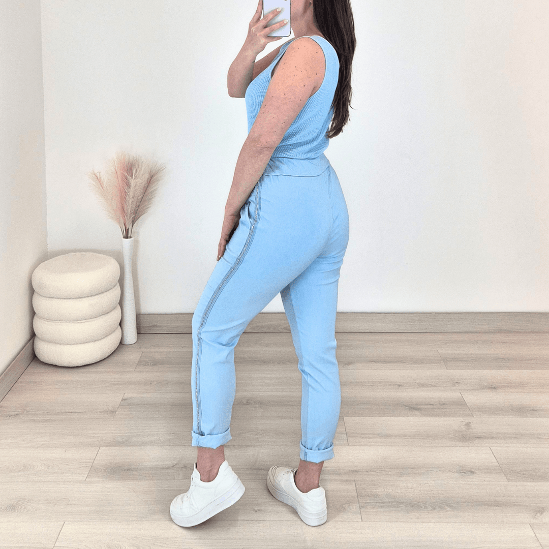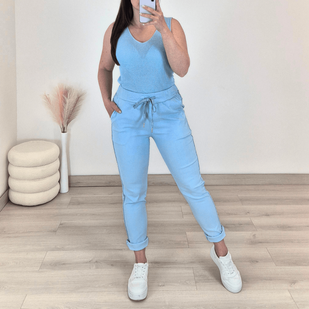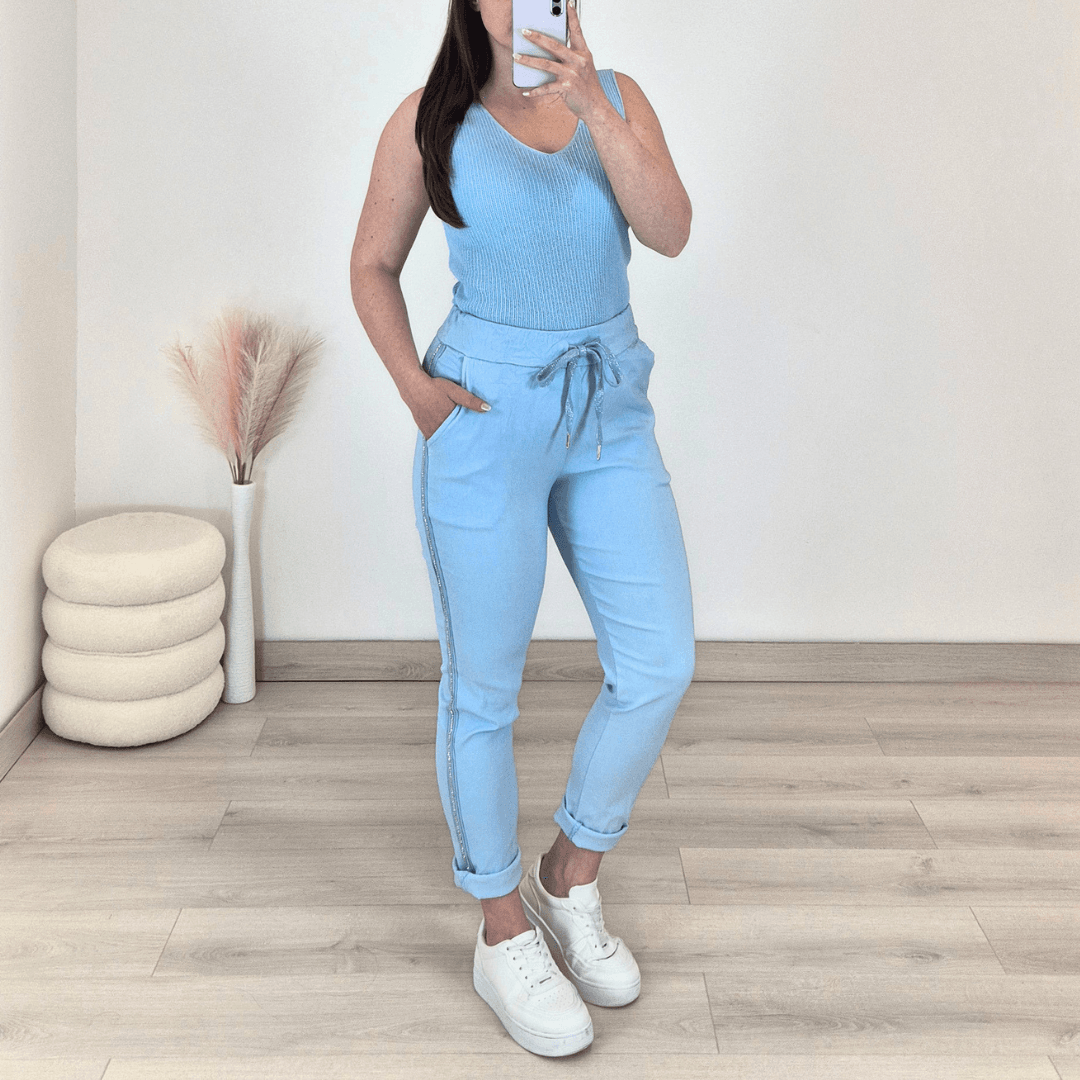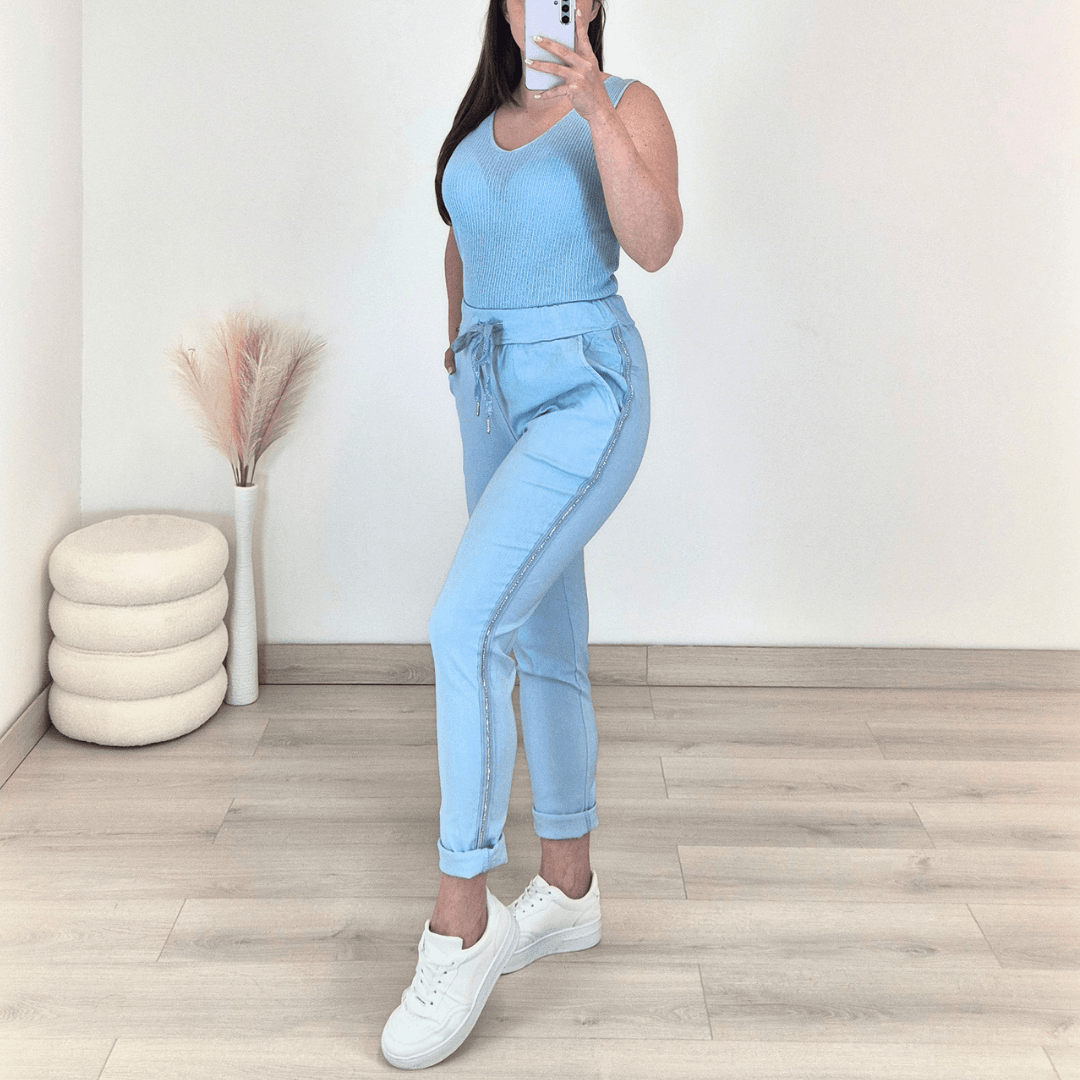 Ženske hlače v modri barvi. Hlače imajo višji pas, hlačnice so dolge, lahko jih zavihate tudi v 7/8. Hlačnice so okrašene z biserčki. Na sprednji strani imajo dva stanska žepa. Hlače so zelo elastične in udobne za nošenje. V pasu je vrvica, s katero lahko nastavite širino. Velikost hlač je univerzalna, primerna od S do XL.