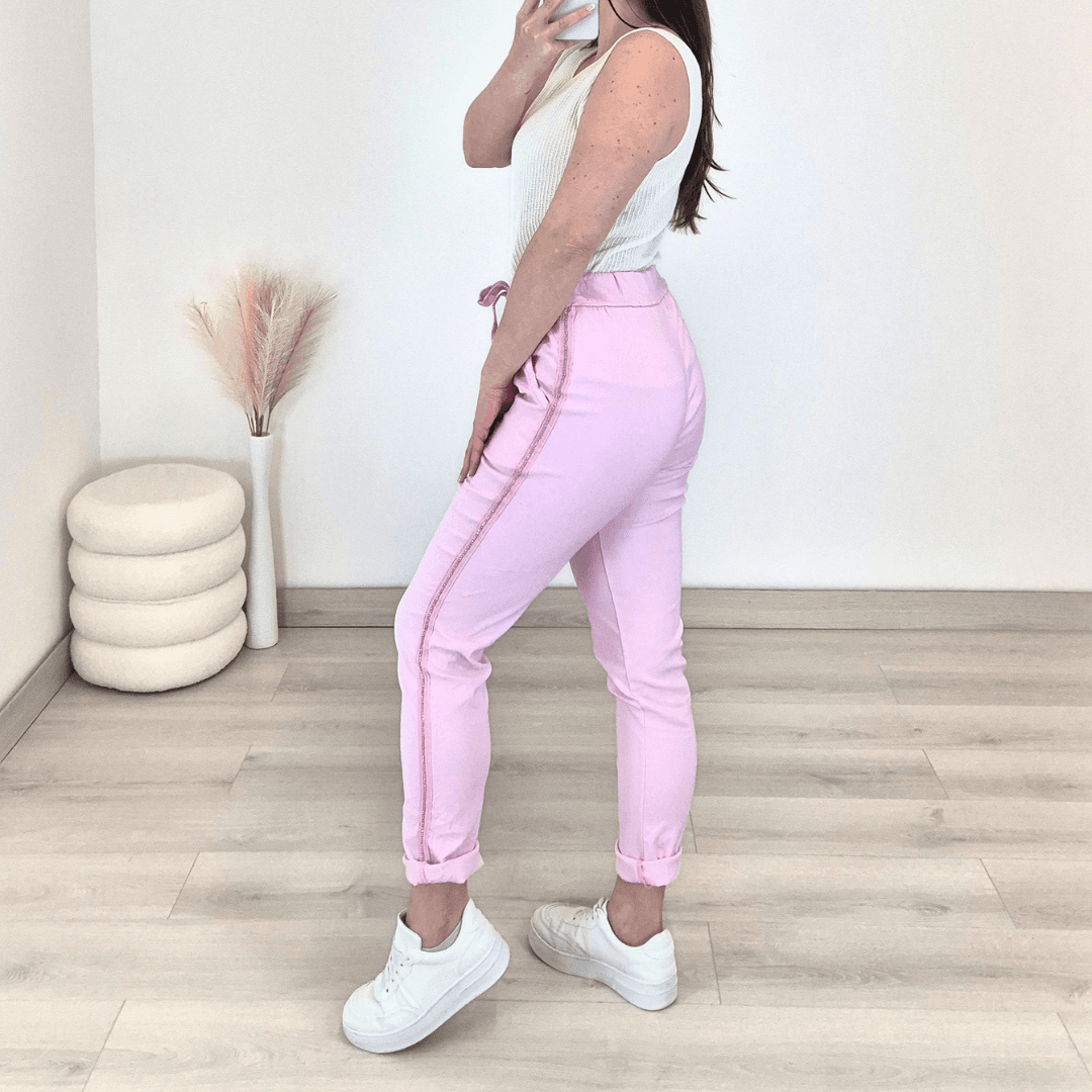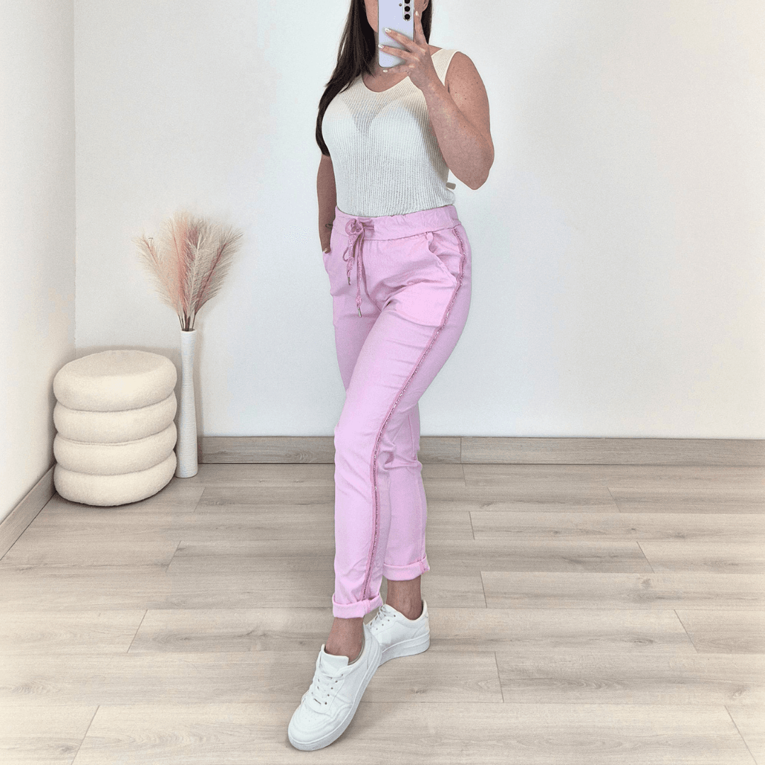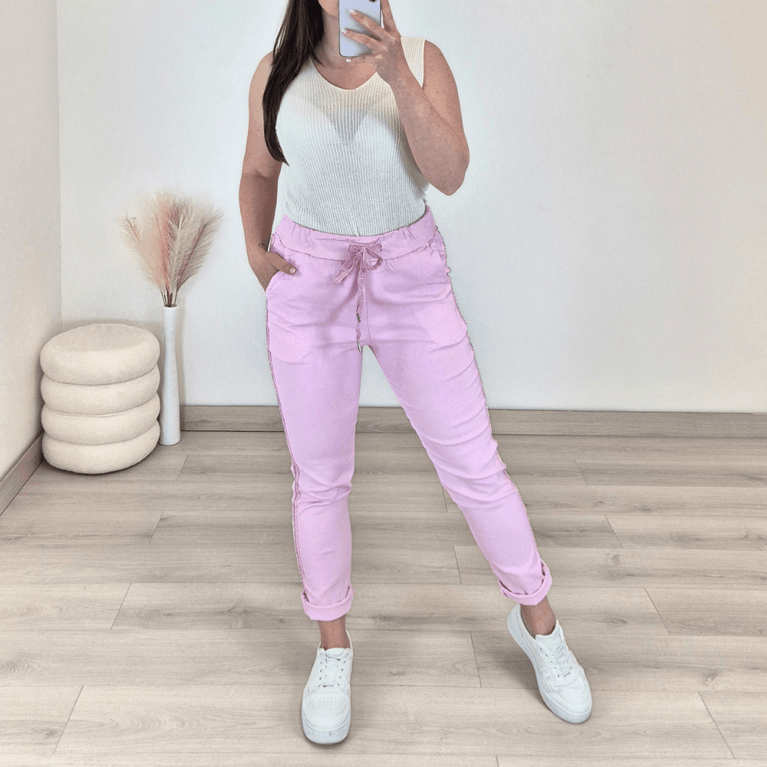 Ženske hlače v roza barvi. Hlače imajo višji pas, hlačnice so dolge, lahko jih zavihate tudi v 7/8. Hlačnice so okrašene z biserčki. Na sprednji strani imajo dva stanska žepa. Hlače so zelo elastične in udobne za nošenje. V pasu je vrvica, s katero lahko nastavite širino. Velikost hlač je univerzalna, primerna od S do XL.