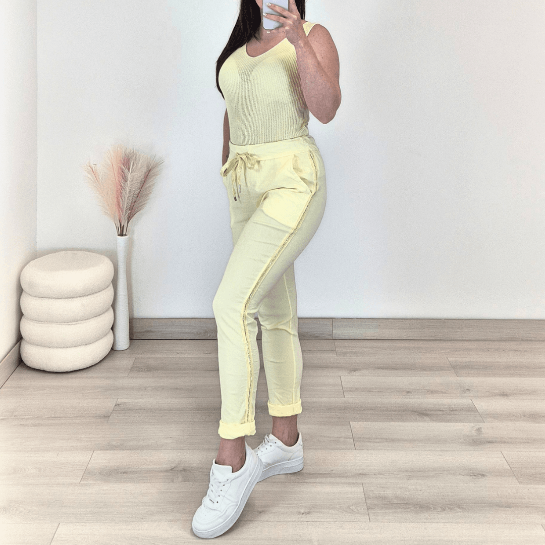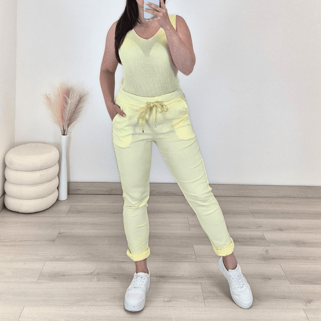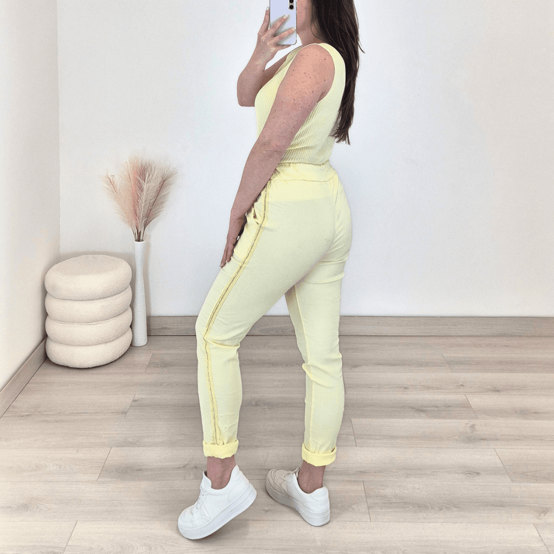 Ženske hlače v rumeni barvi. Hlače imajo višji pas, hlačnice so dolge, lahko jih zavihate tudi v 7/8. Hlačnice so okrašene z biserčki. Na sprednji strani imajo dva stanska žepa. Hlače so zelo elastične in udobne za nošenje. V pasu je vrvica, s katero lahko nastavite širino. Velikost hlač je univerzalna, primerna od S do XL.