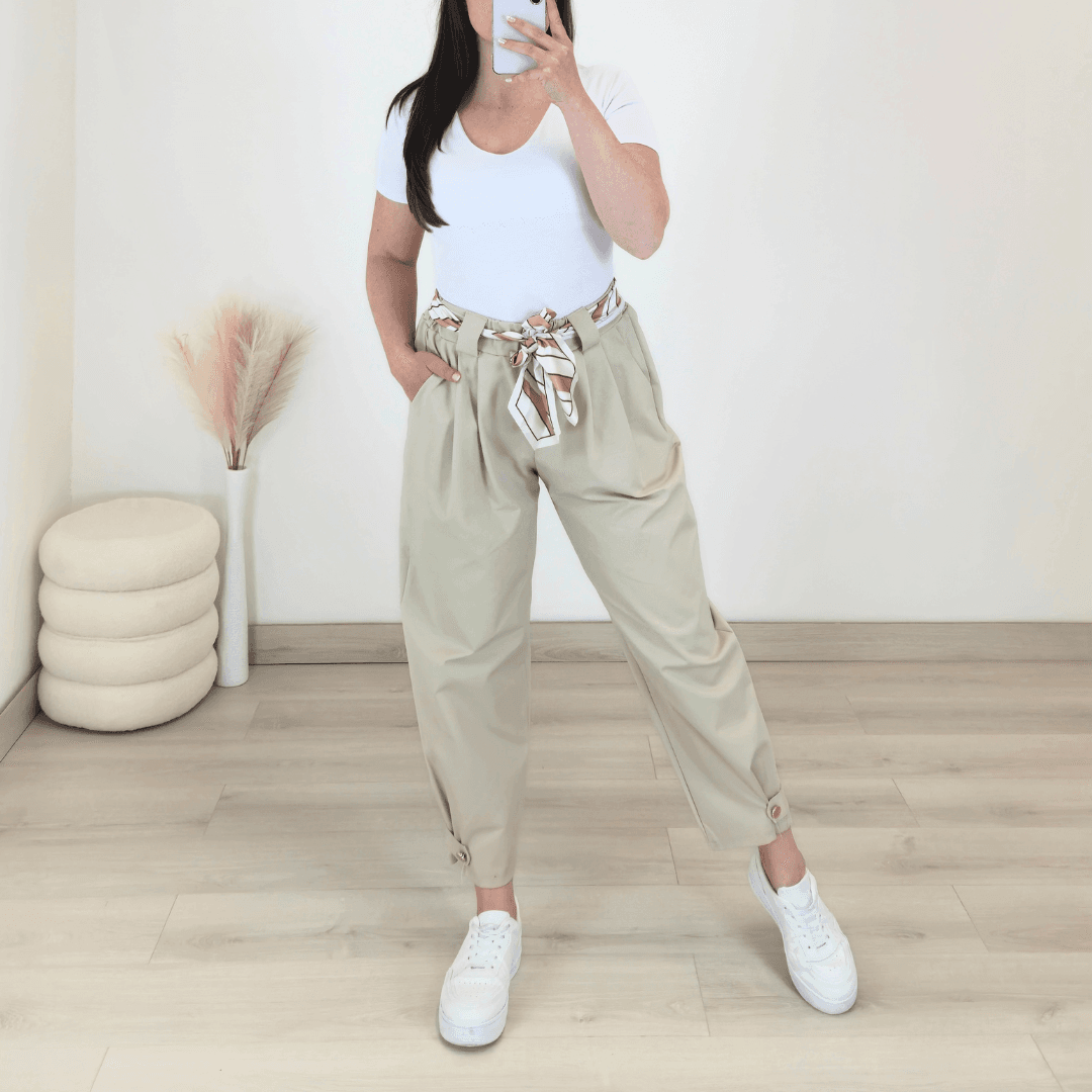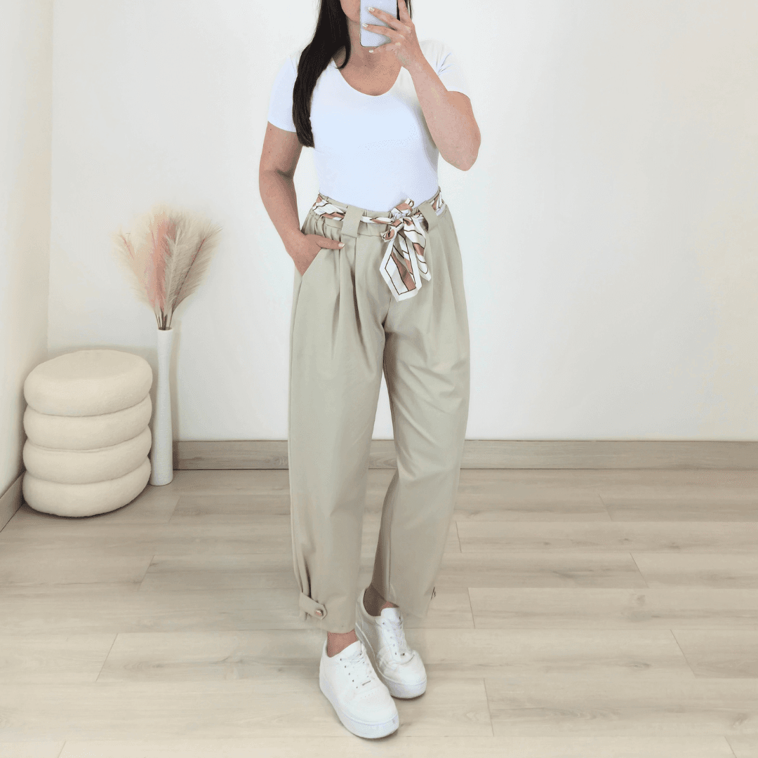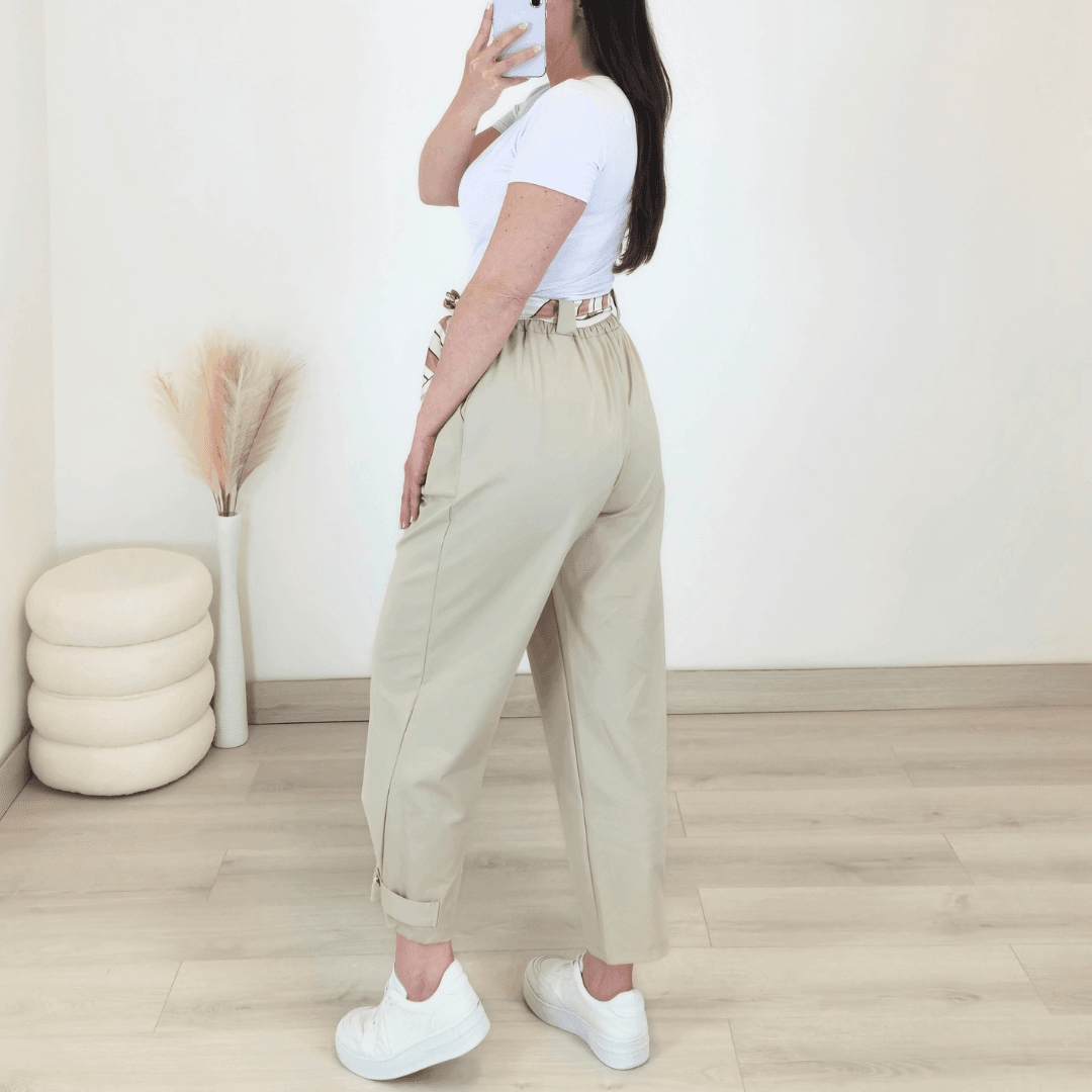 Modne ženske hlače v bež barvi. Hlače imajo višji pas z elastiko in dva stranska žepa. Hlačnice so dolge in širše, na koncu jih krasita trak in gumb. Izdelane so iz bombaža in so prijetne za nošenje. Dodan je še dekorativni pas. Velikost je univerzalna in je primerna za S do XL.