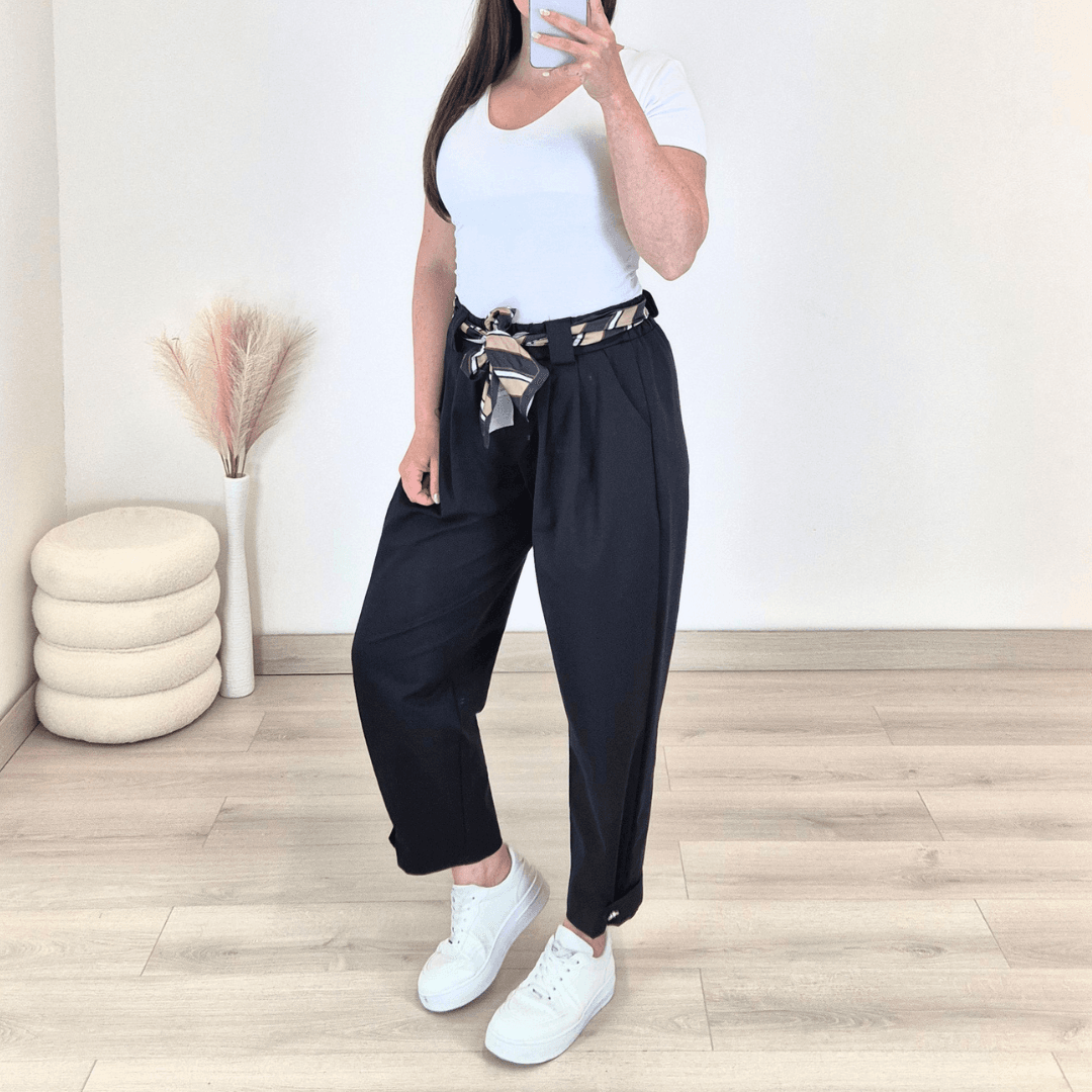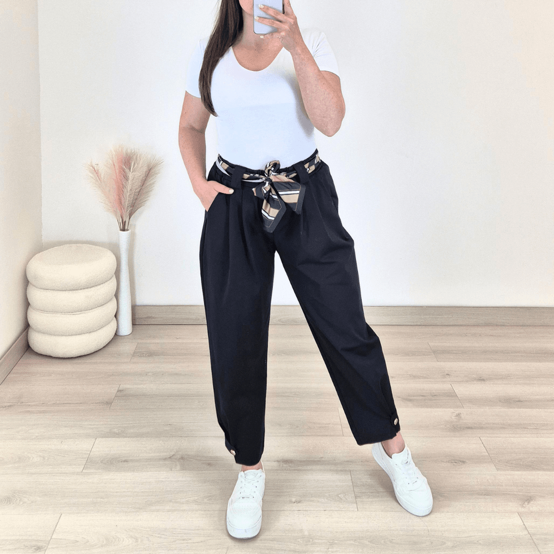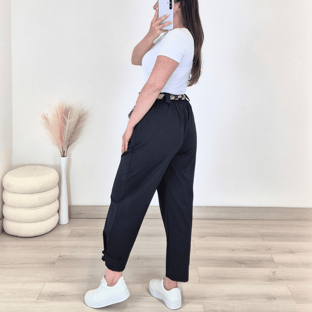 Modne ženske hlače v črni barvi. Hlače imajo višji pas z elastiko in dva stranska žepa. Hlačnice so dolge in širše, na koncu jih krasita trak in gumb. Izdelane so iz bombaža in so prijetne za nošenje. Dodan je še dekorativni pas. Velikost je univerzalna in je primerna za S do XL.