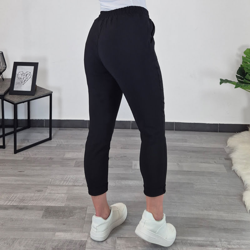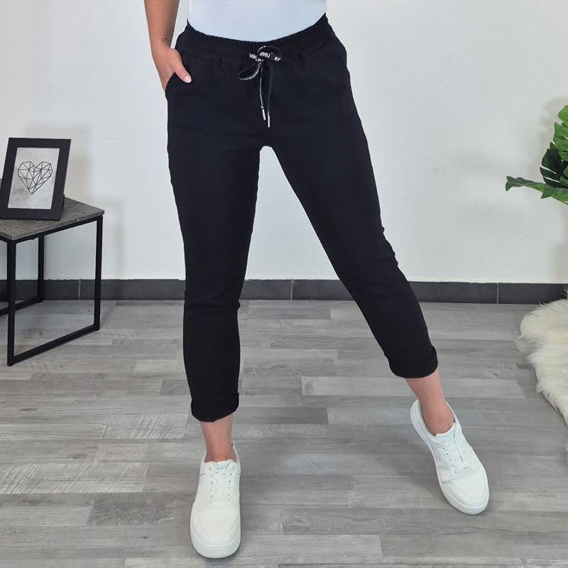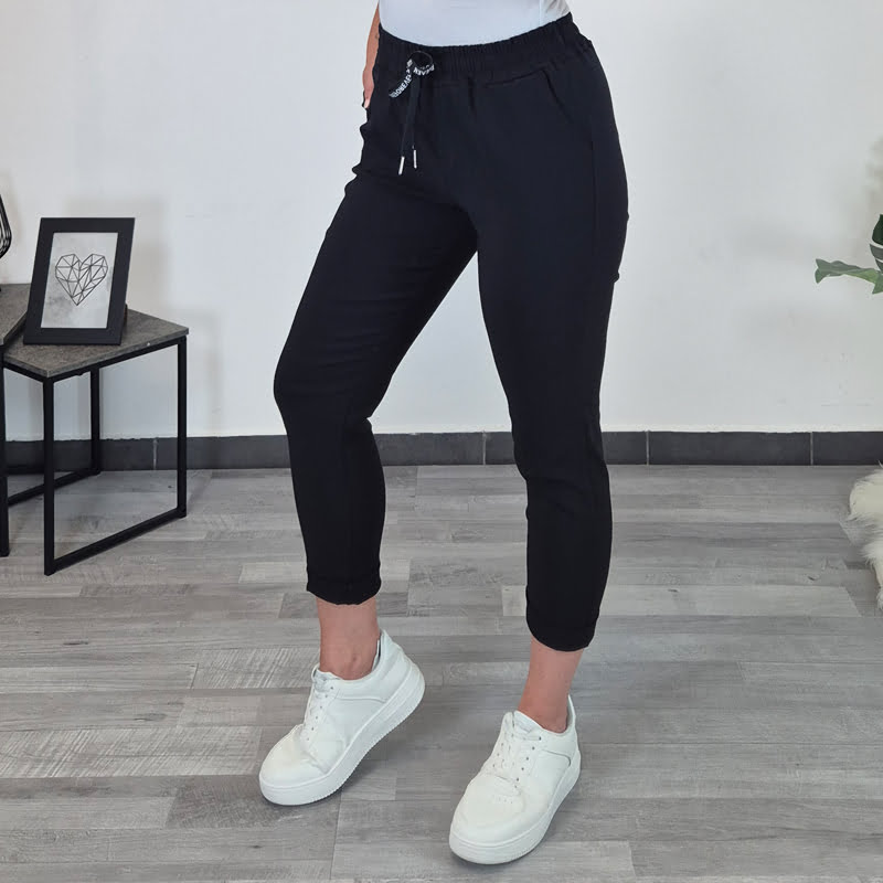 Ženske hlače z elastiko v pasu. Hlače so zelo elastične, so v črni barvi, imajo dva stranska žepa, v pasu je dodana še vrvica. Hlačnice so oprijete in dolžine 7/8.