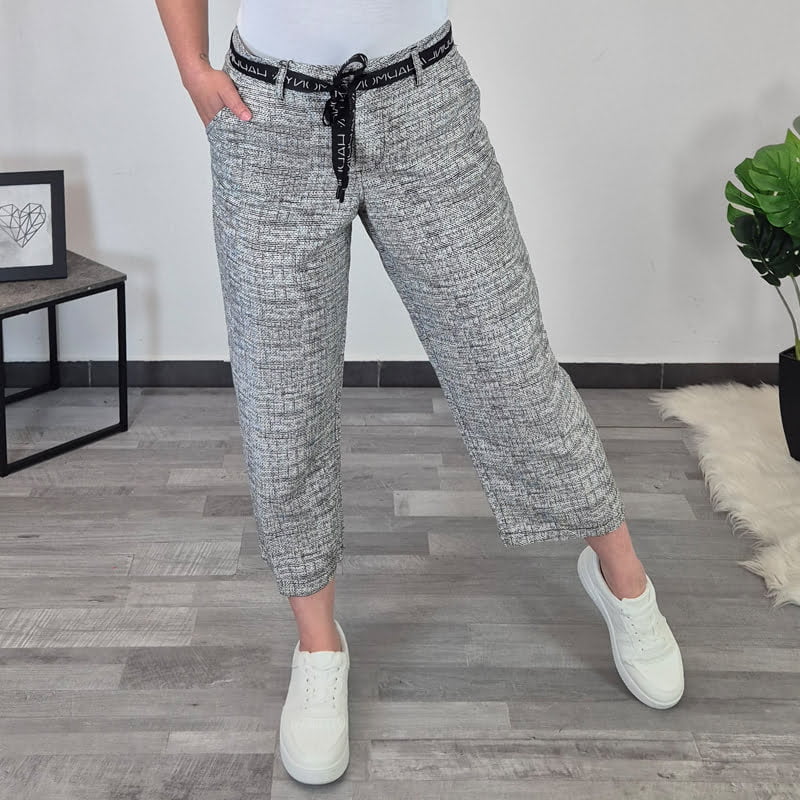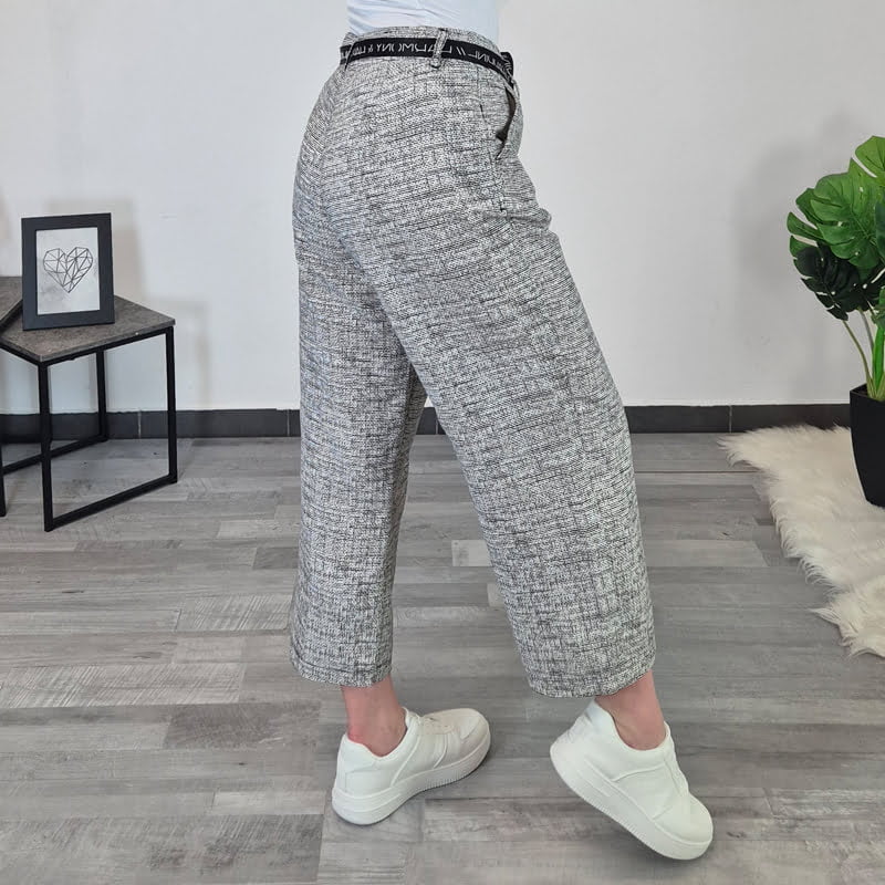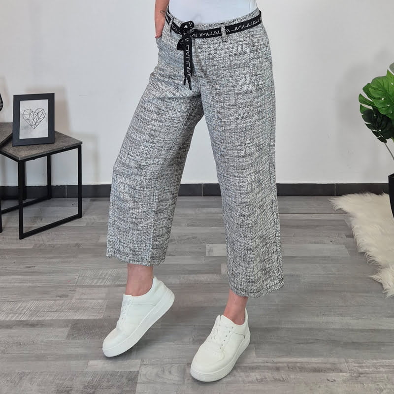 Ženske hlače Kate blagovne znamke Kenny S. Hlače so izdelane iz visoko kvalitetne mešanice viskoze in lanenega platna. Hlače imajo široke hlačnice in so dolžine 7/8. Na voljo so od številke 36 do 46.
