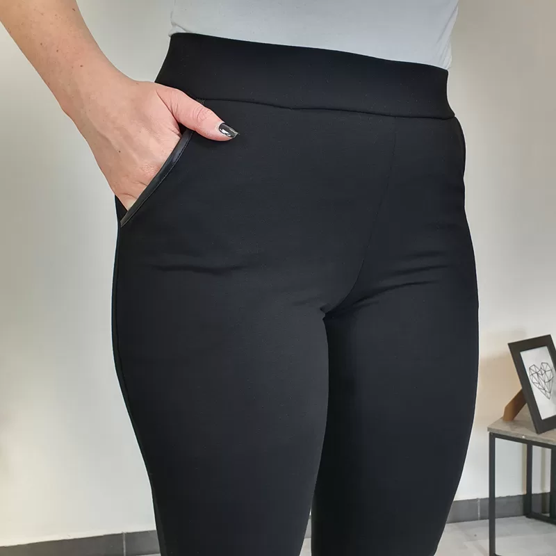 Modne ženske hlače Klara v črni barvi. Hlače imajo rahlo višji pas in dva stranska žepa. Hlačnice so dolge, na koncu je dodan razporek, kar hlačam daje izredno zanimiv izgled.