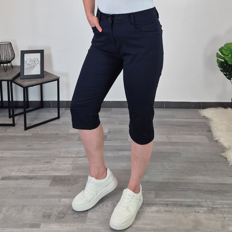 Ženske poletne hlače v temno modri barvi. Hlače so narejene iz elastičnega in tankega materiala. Hlačnice so v dolžini 3/4. Hlače imajo na zadnji strani in na sprednji strani po dva žepa. Hlače so lahko odlična izbira za poletne dni in popestritev vaše garderobe. Na voljo od številke 38 do 50.