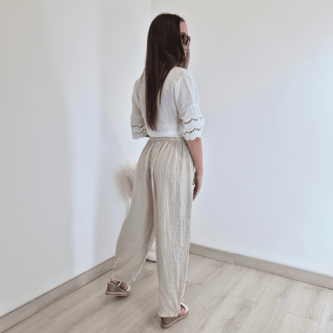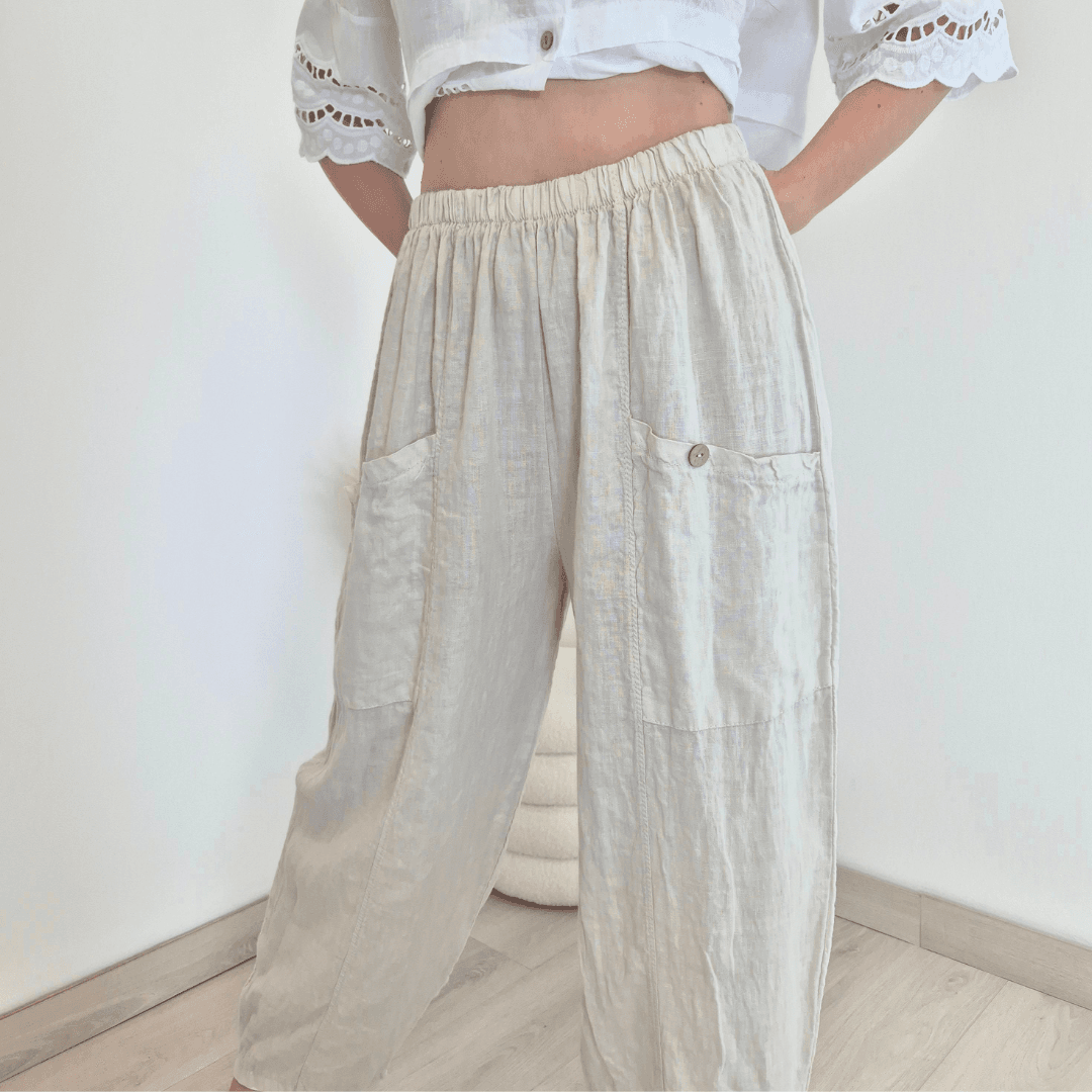 Modne ženske hlače iz kolekcije Lanna v bež barvi. Hlače imajo višji pas z elastiko in dva velika sprednja žepa. Hlačnice so dolge in široke. Izdelane so iz 100% lanu, zato so odlična izbira za vroče dni. Velikost je univerzalna, primerna za S do XL/XXL. Vse kose iz kolekcije Lanna lahko med sabo lepo kombinirate.