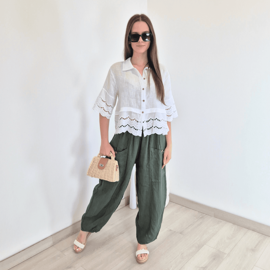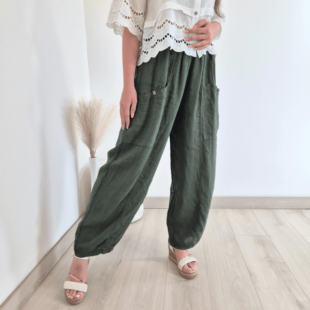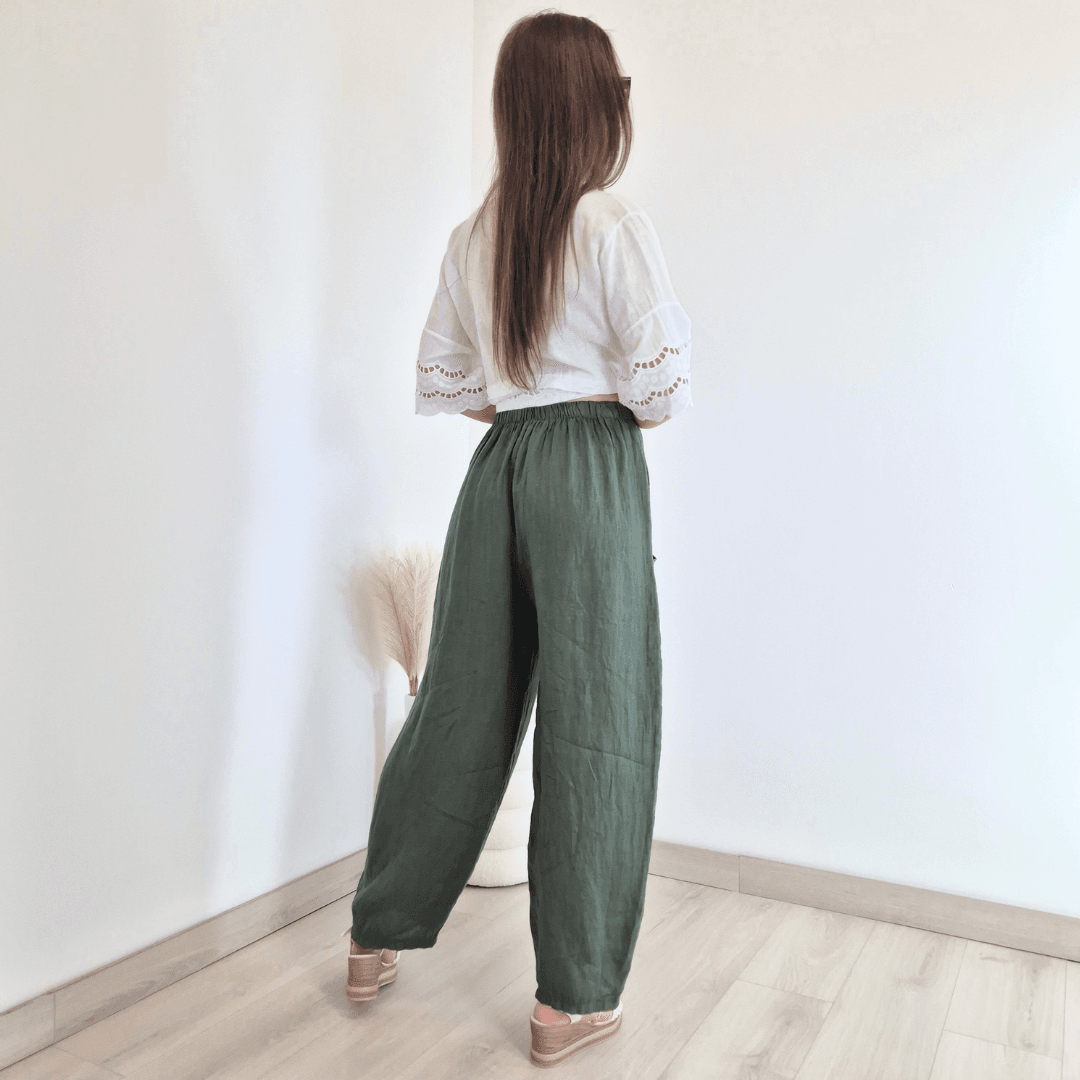 Modne ženske hlače iz kolekcije Lanna v olivno zeleni barvi. Hlače imajo višji pas z elastiko in dva velika sprednja žepa. Hlačnice so dolge in široke. Izdelane so iz 100% lanu, zato so odlična izbira za vroče dni. Velikost je univerzalna, primerna za S do XL/XXL. Vse kose iz kolekcije Lanna lahko med sabo lepo kombinirate.