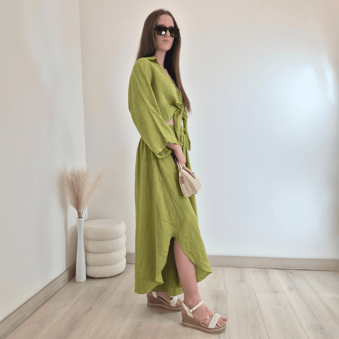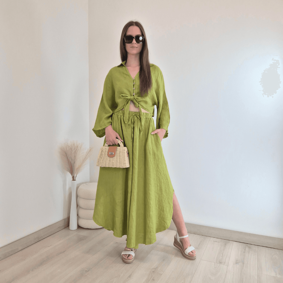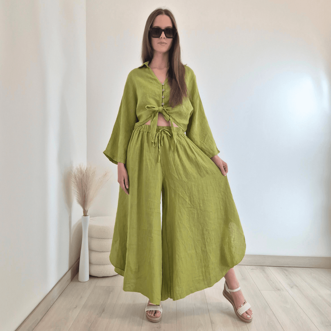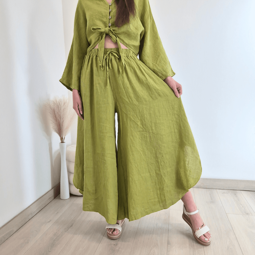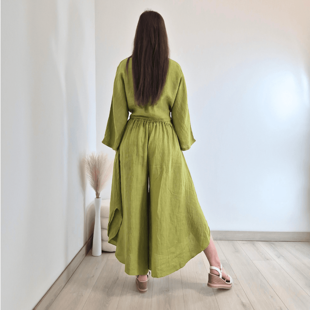 Modne ženske hlače iz kolekcije Lanna v zeleni barvi. Hlače imajo višji pas z elastiko in dva stranska žepa. Hlačnice so široke in asimetrične. Izdelane so iz 100% lanu, zato so odlična izbira za vroče dni. Velikost je univerzalna, primerna za S do XL/XXL. Vse kose iz kolekcije Lanna lahko med sabo lepo kombinirate.