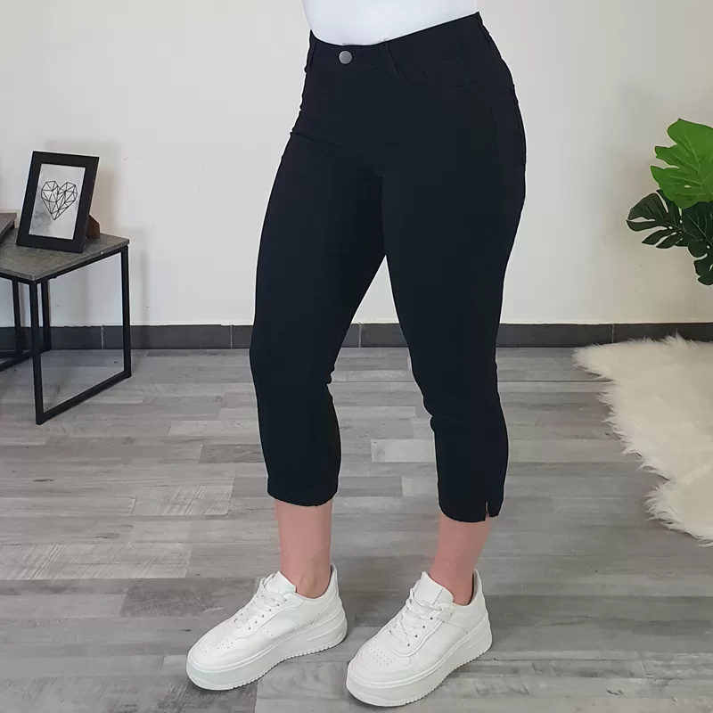 Ženske kapri hlače Lilly v črni barvi. Hlače imajo srednje visok pas, zapenjajo se z zadrgo in gumbom. So izredno elastične in mehke, udobne za nošenje. Hlačnice so dolžine 3/4, na koncu so malenkost širše in imajo manjši razporek. Na sprednji in zadnji strani sta dodana po dva žepa. Hlače boste odlično kombinirale s svojimi najljubšimi oblačili. Na voljo so od številke 36 do številke 46.