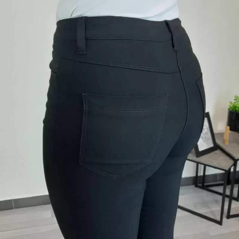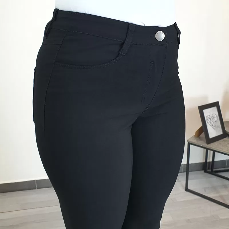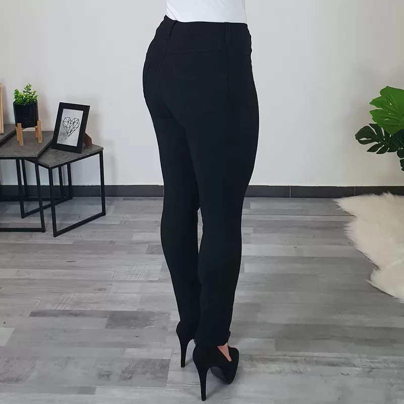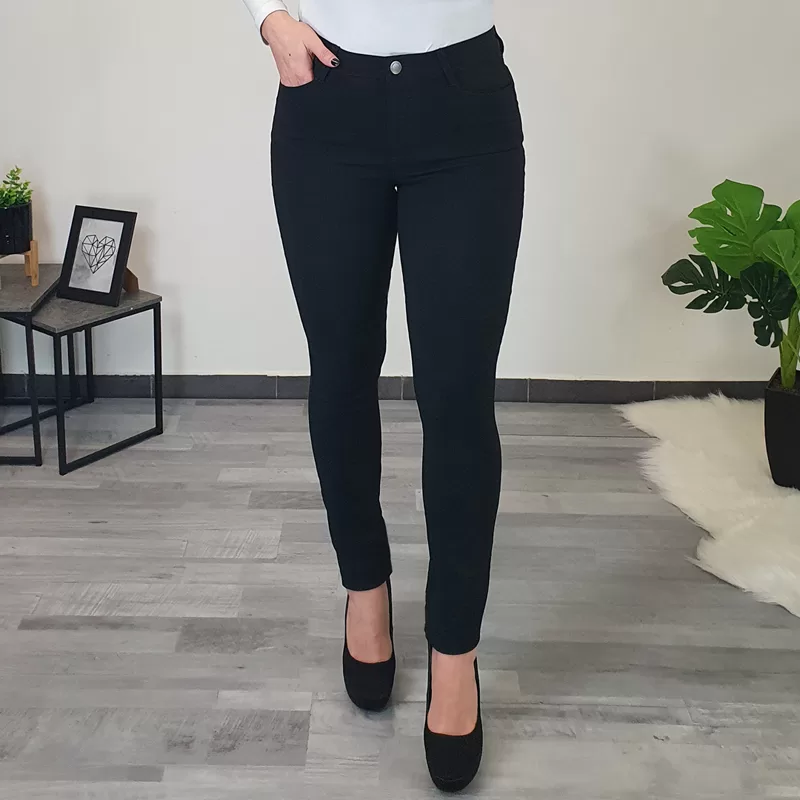 Modne hlače Lilly v črni barvi. Hlače so izdelane iz kvalitetne mešanice viskoze in poliamida. So zelo elastične in izjemno udobne za nošenje. Hlače so na zadrgo, imajo dva stranska žepa in dva žepa na zadnji strani. Hlačnice so dolge in krojene ozko.
