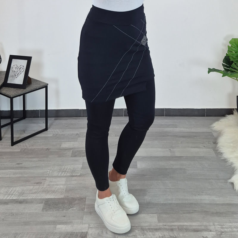 Modne ženske hlače Rosela v temno modri barvi. Hlače so dolge in so sestavljene iz dveh delov – spodaj so bombažne pajkice, zgoraj pa krilo z dodatkom srebrnih nitk. Hlače so elastične in udobne za nošenje.