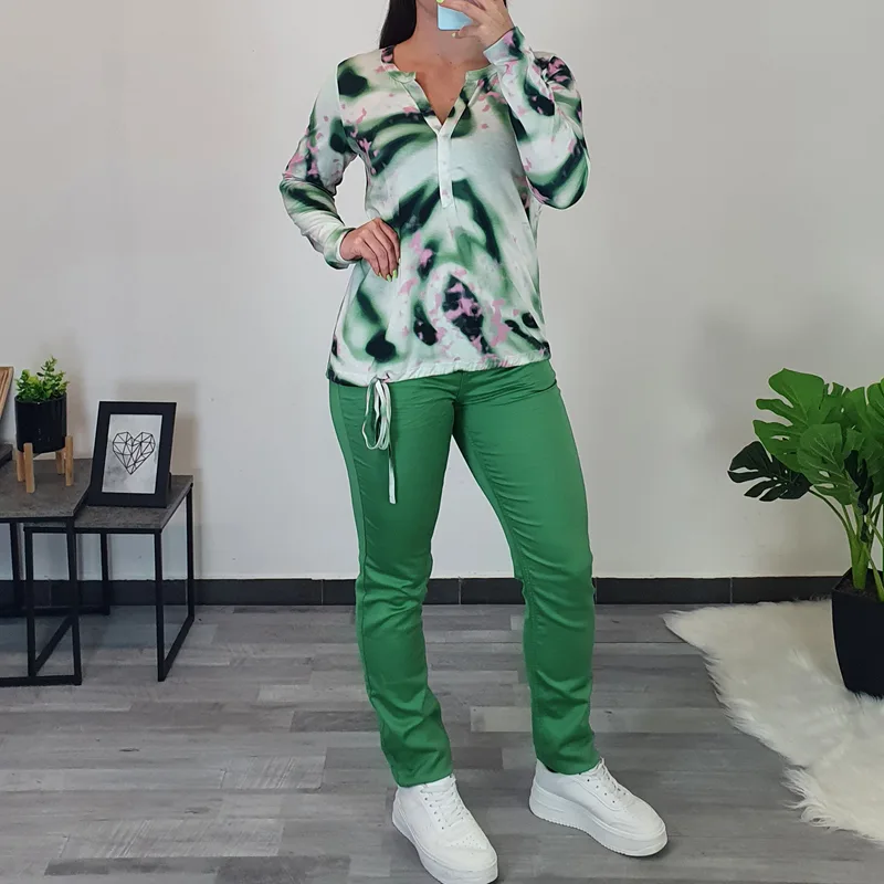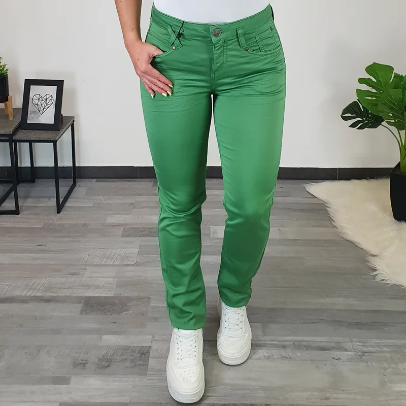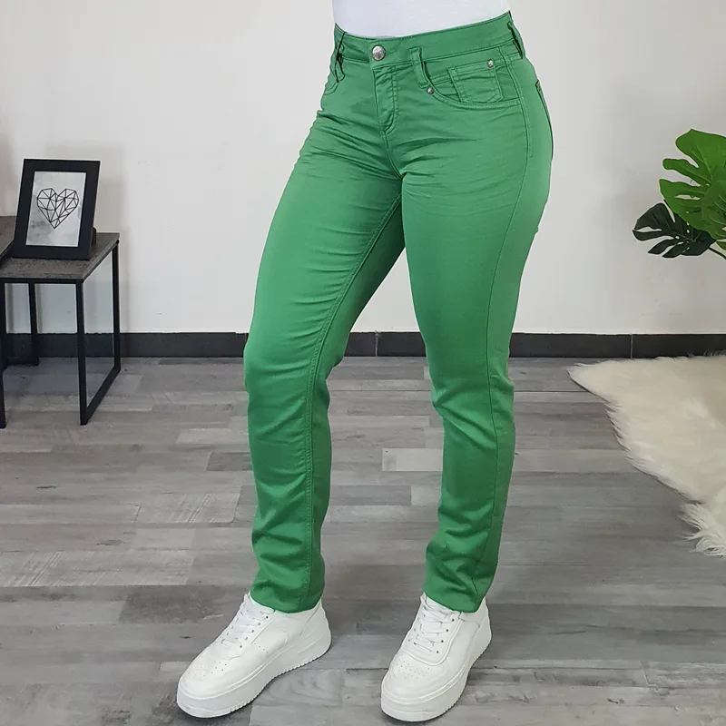 Ženske hlače Stella blagovne znamke Kenny S. Hlače so v modni zeleni barvi, narejene so iz mehkega bombaža in so primerne za vsak dan. Hlače se zapenjajo z zadrgo in gumbom, na sprednji in zadnji strani imajo žepe. Pas je srednje visok in se lepo prilega postavi. Hlačnice so ožje. Na voljo so od številke 36 do 46.