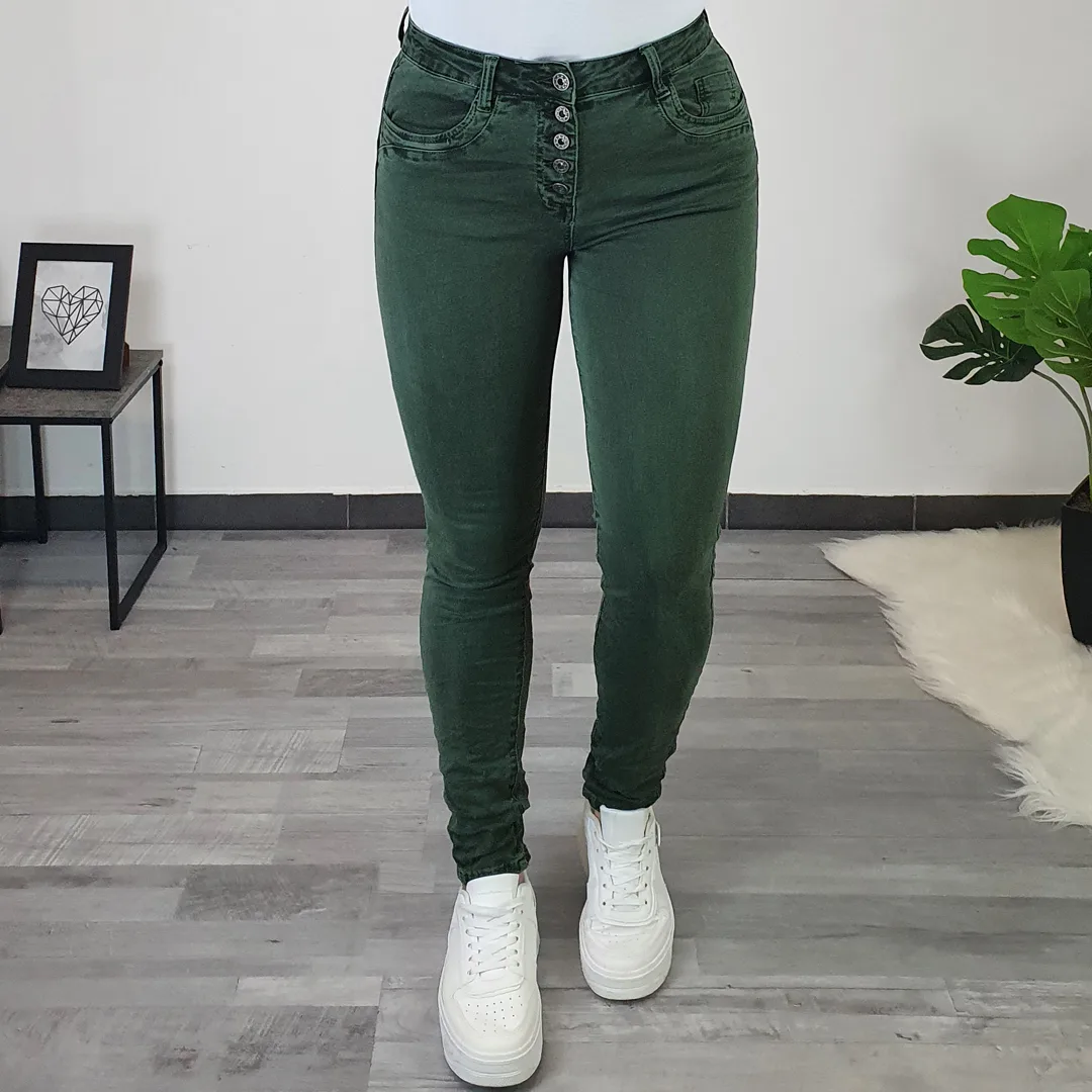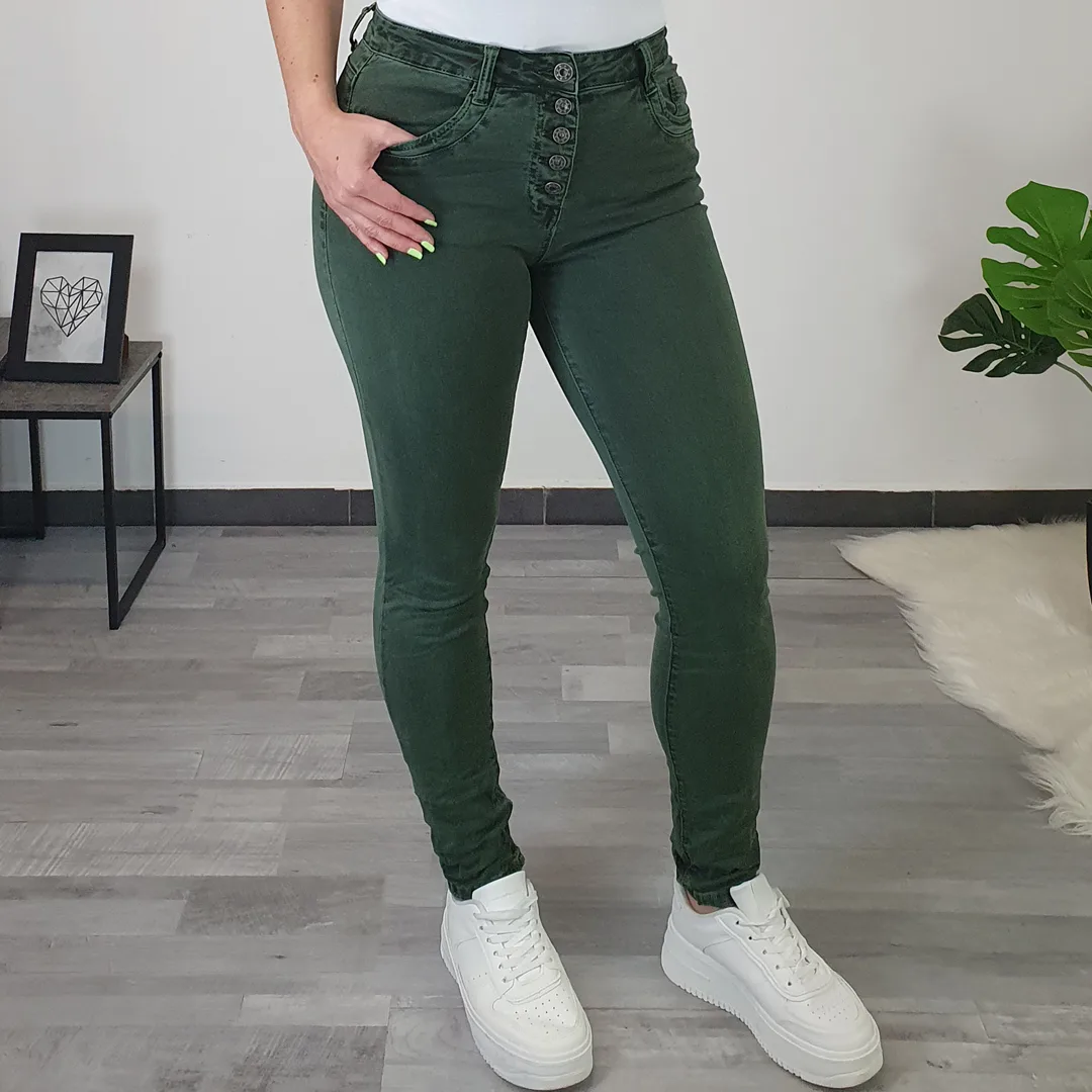 Ženske hlače v olivno zeleni barvi. Narejene so iz zelo elastičnega materiala in so zelo udobne za nošenje. Hlače se zapenjajo z gumbi, kar jih naredi posebne. Ob straneh in na zadnji strani imajo dodane žepe.