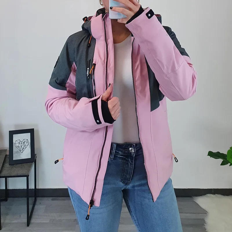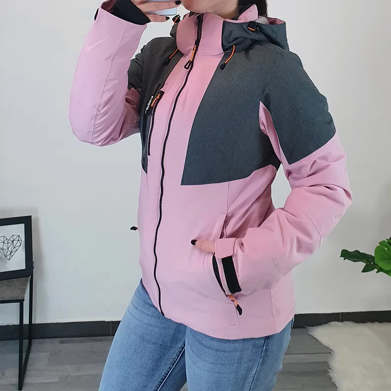 Icepeak ženska zimska bunda Faenza za zimske aktivnosti. Bunda ima kapuco, ki jo lahko po želji tudi snamete. Ima 3 zunanje žepe, ki se zapenjajo z zadrgo, na notranji strani ima še 2 dodatna žepa. Žepi so podloženi, tako da si lahko pogrejete roke. Bunda je sestavljena iz dveh barv – iz živo roza ter sive barve, po celotni dolžini pa se zapenja z zadrgo. Narejena je iz materiala, ki je vodoodporen, paraprepusten, ter ščiti pred vetrom (10000mm/5000g/m2/24h). Bunda je izdelana iz dvoslojne tkanine, v kateri je nepremočljiva membrana povezana z večnamenskim materialom. Na notranji strani ima snegolov, ki prepričuje vdor snega v notranjost, tako da je primerna tudi za smučanje, sankanje ipd. Na koncu rokava je dodan ‘ježek’ s katerim lahko rokav po želi ožate in krajšate. Šivi bunde so lepljeni.